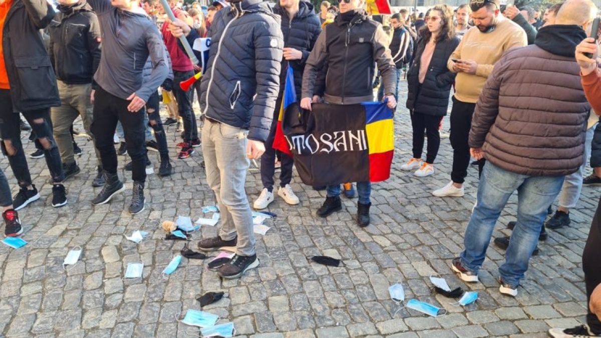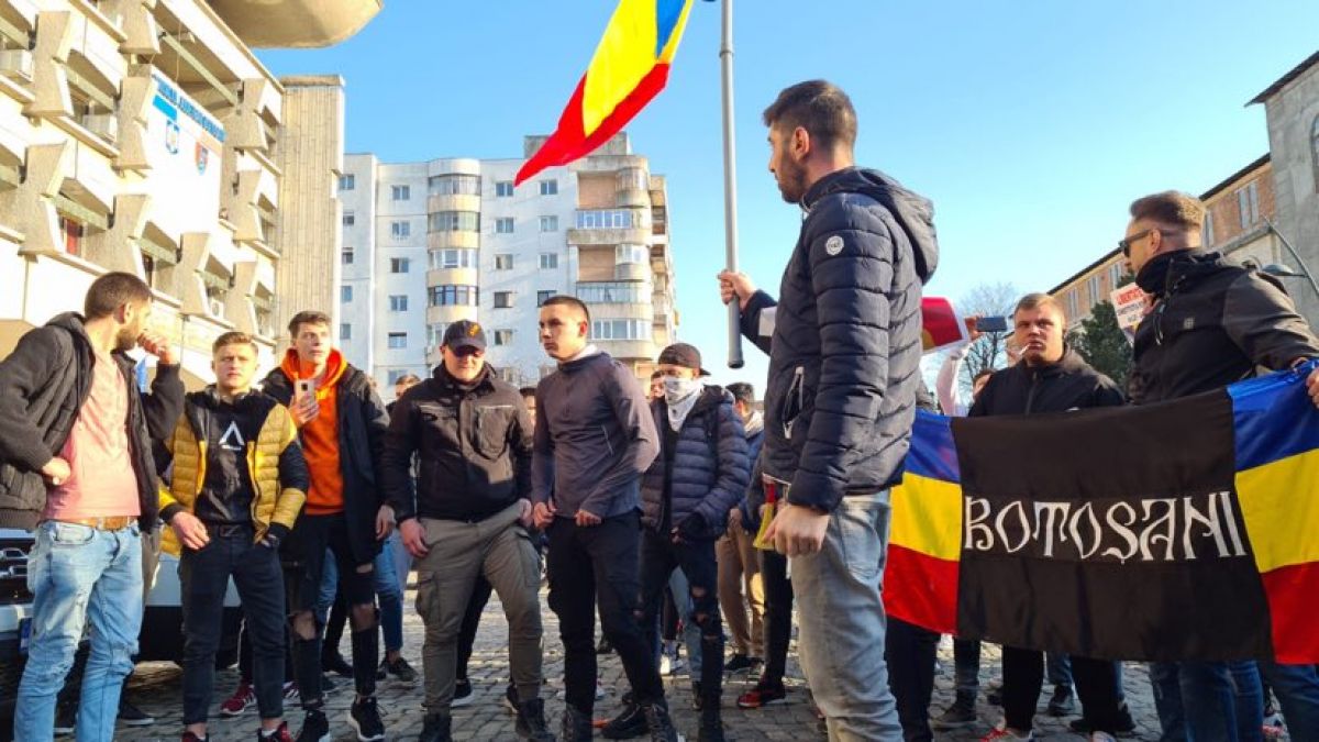 Iar acțiunea de stradă este pe cale să degenereze. Un nucleu format se pare din membrii galeriei FC Botoșani au scandat ”Libertate” și ”La pușcărie, cu toții la pușcărie” și au cântat: ”Noi suntem români, noi suntem pe veci aici stăpâni”.