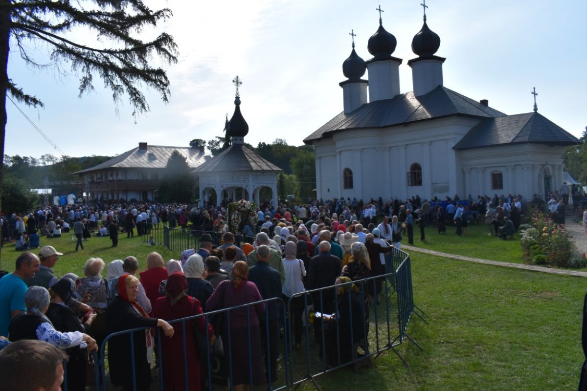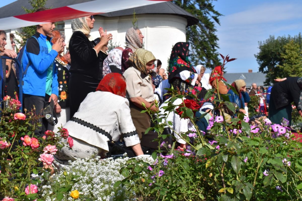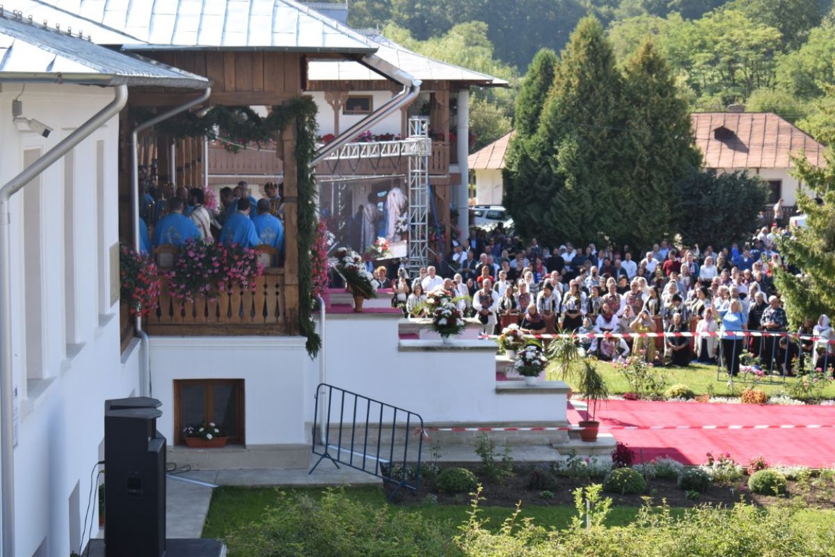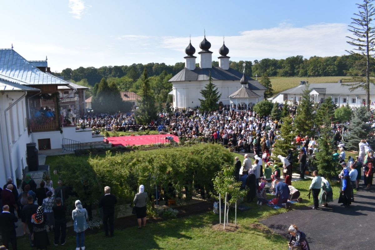 În interior, o mare de credincioși era răsfirată pe iarba din curtea Mănăstirii. Îmbrăcați în straie populare mulți dintre ei, cu copii în brațe sau lăsați să se joace pe pături. Oameni cu capul plecat într-o rugăciune tăcută sau în genunchi, atenți la slujba oficiată sus pe treptele clădirii principale.