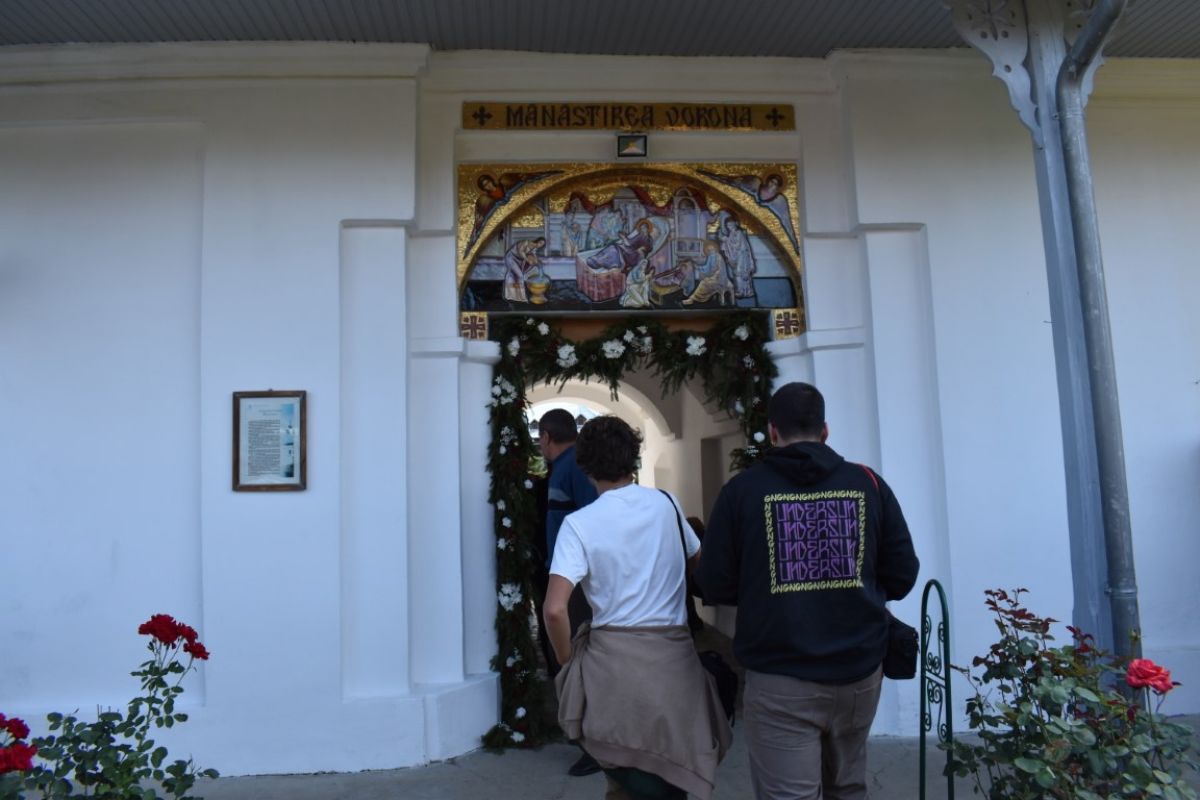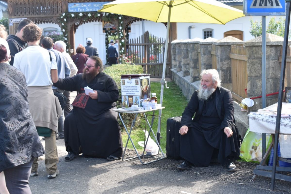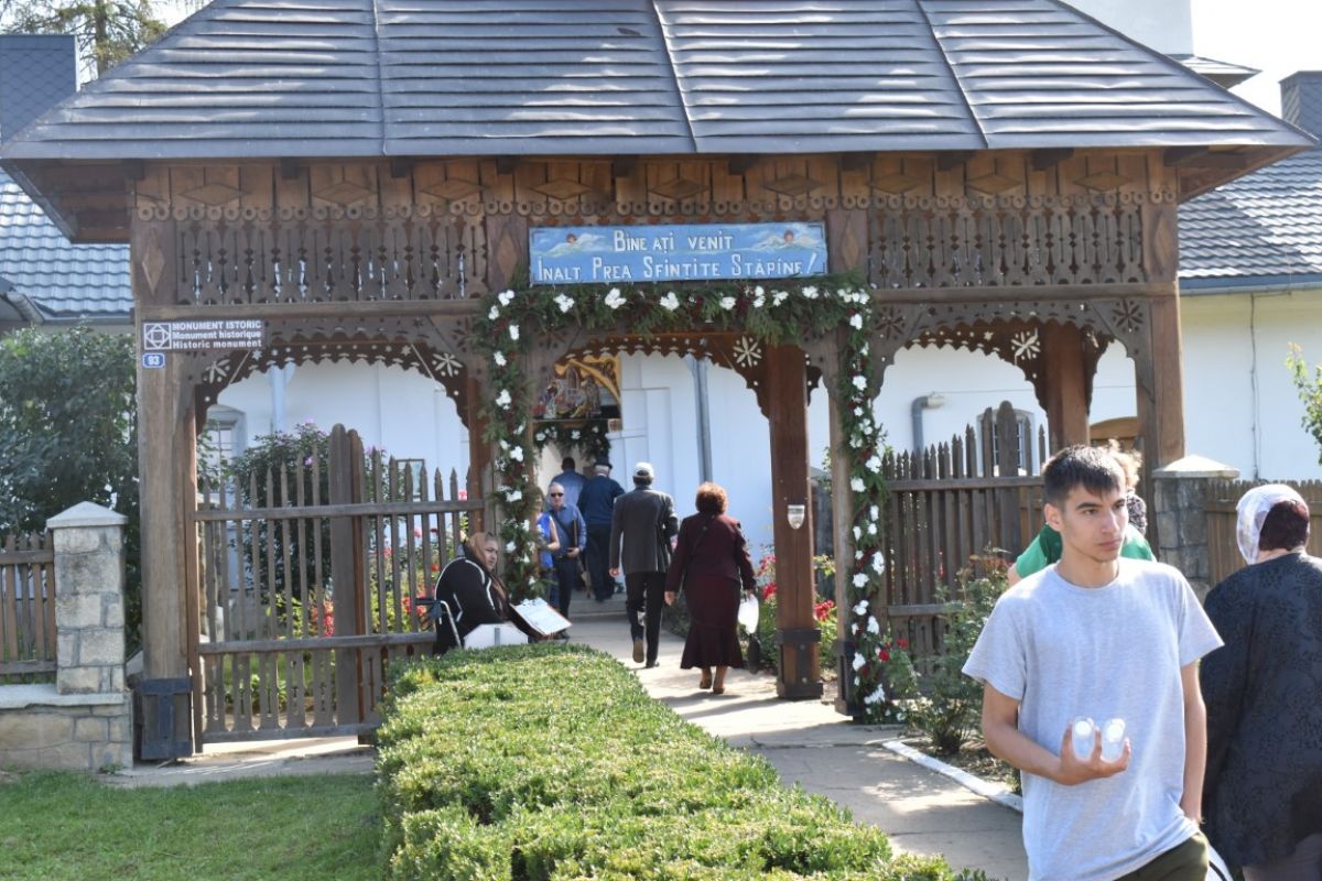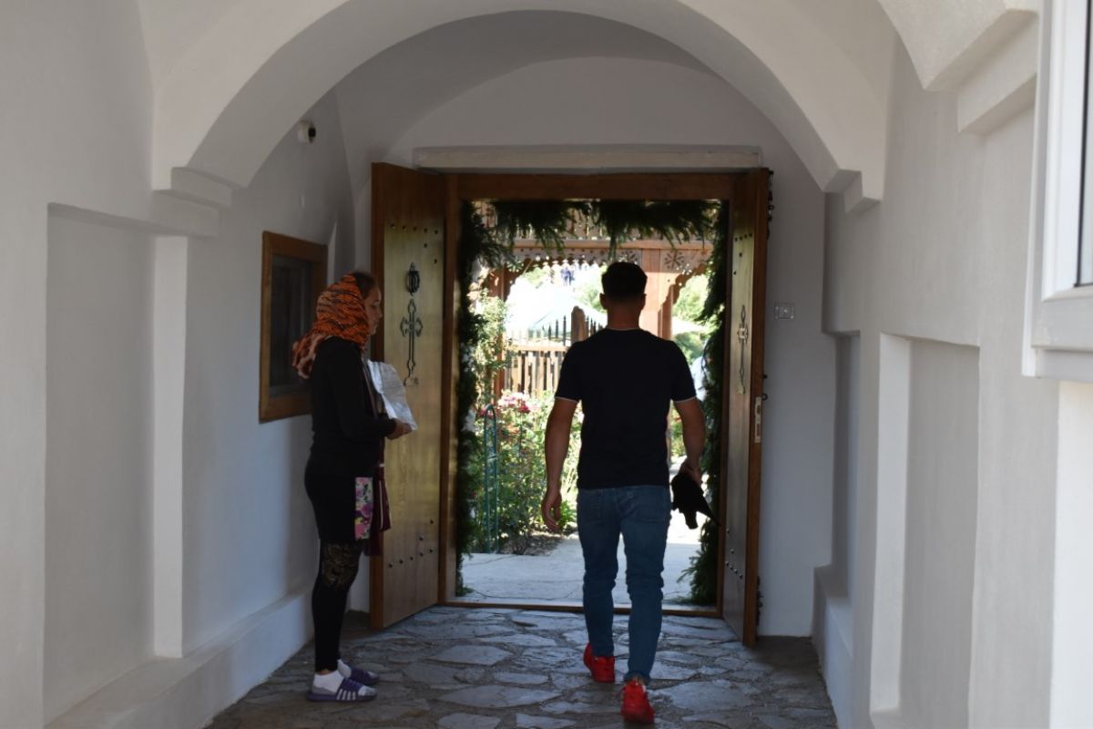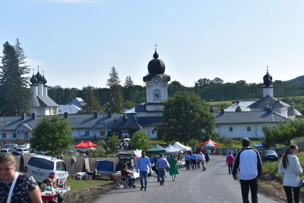 În interior, o mare de credincioși era răsfirată pe iarba din curtea Mănăstirii. Îmbrăcați în straie populare mulți dintre ei, cu copii în brațe sau lăsați să se joace pe pături. Oameni cu capul plecat într-o rugăciune tăcută sau în genunchi, atenți la slujba oficiată sus pe treptele clădirii principale.