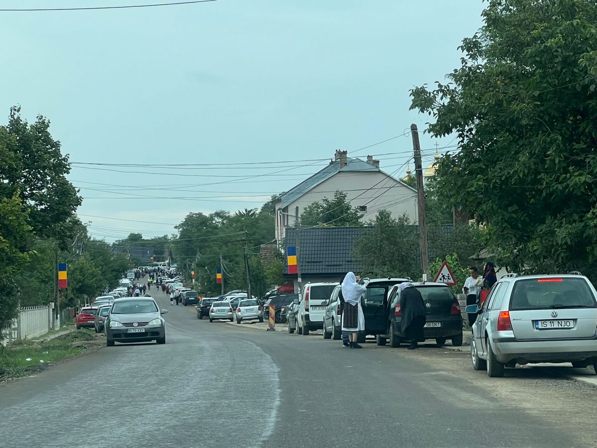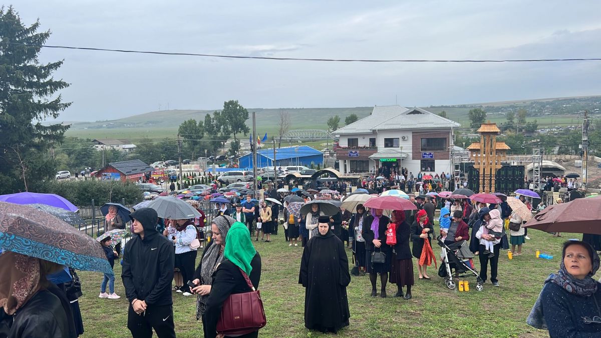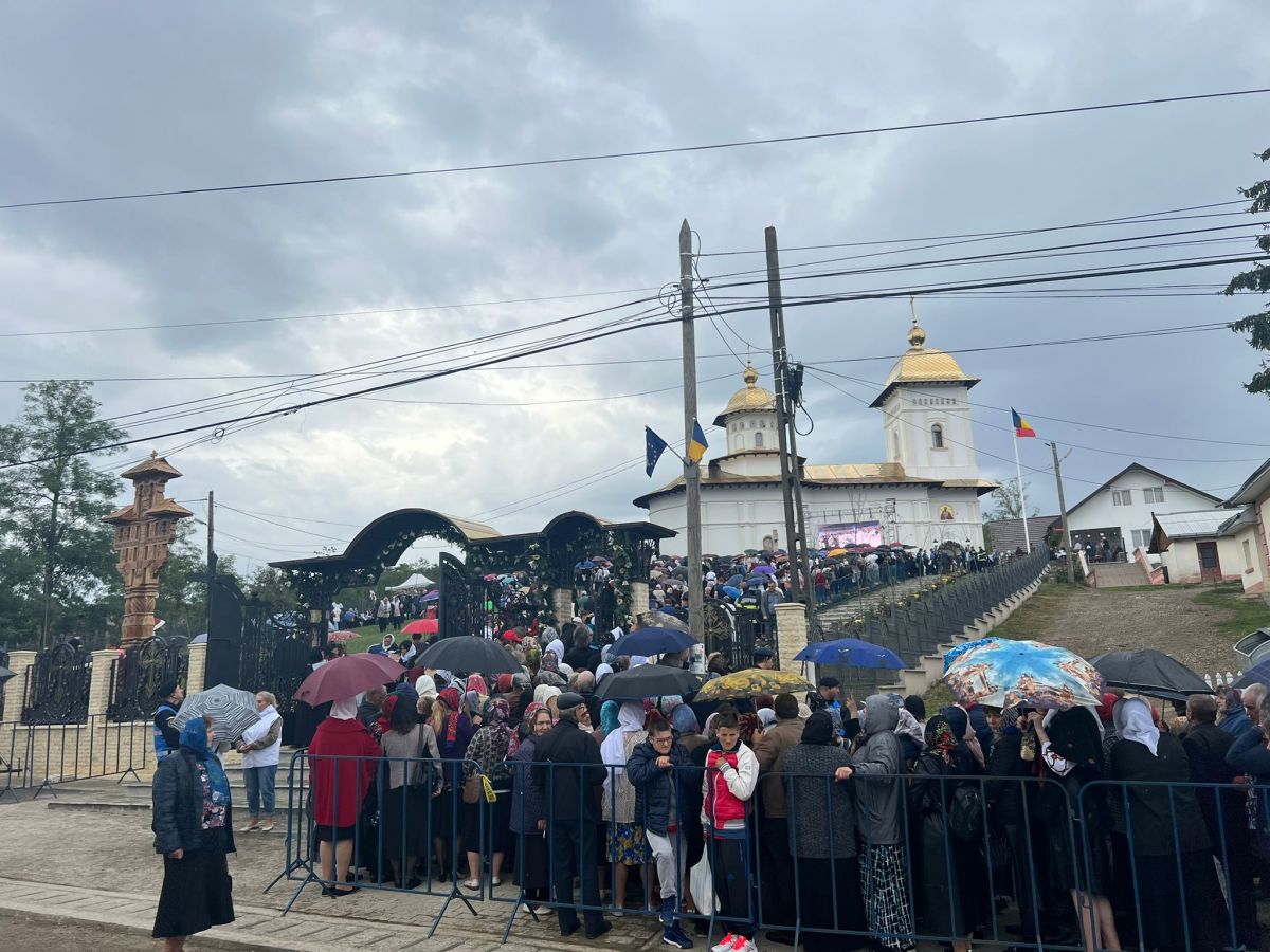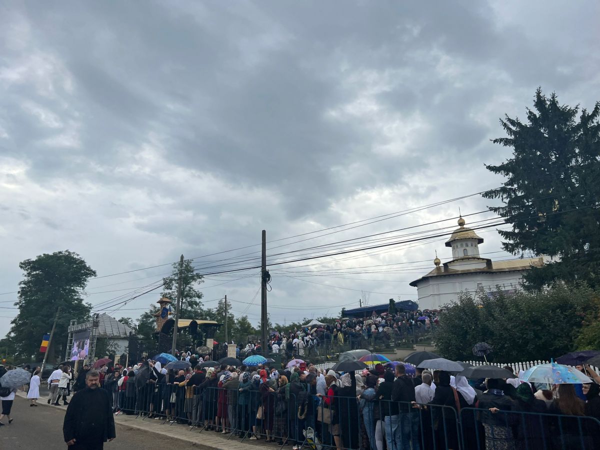 Oamenii au venit cu umbrele, pentru că din cer cade o ploaie măruntă. Mulți credincioși poartă straie populare. Slujba de sfințire are loc în afara bisericii, într-un spațiu special pregătit în acest sens. Organizatorii au montat afară și un ecran uriaș pentru ca toată lumea să poată urmări slujba religioasă.