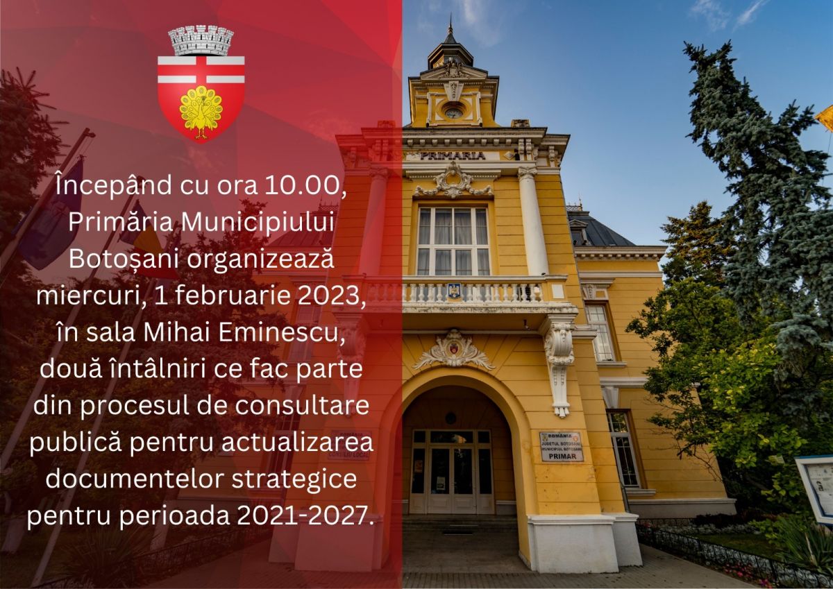 Primăria Municipiului Botoșani organizează miercuri, 1 februarie 2023, în sala Mihai Eminescu, două întâlniri ce fac parte din procesul de consultare publică pentru actualizarea documentelor strategice pentru perioada 2021-2027.