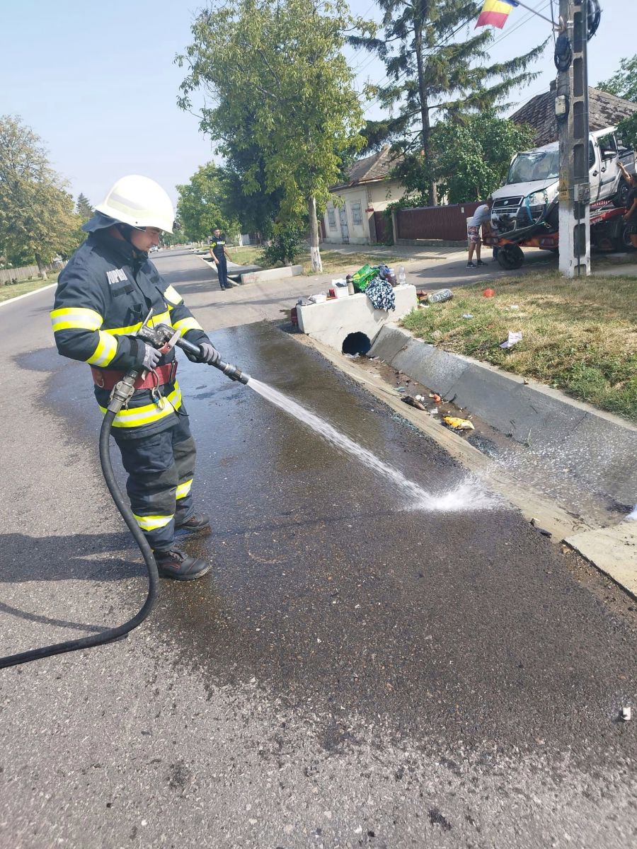 Pompierii au acționat și pentru sablarea carosabilului și înlăturarea pericolului de incendiu prin deconectarea bornelor de la autovehicule.