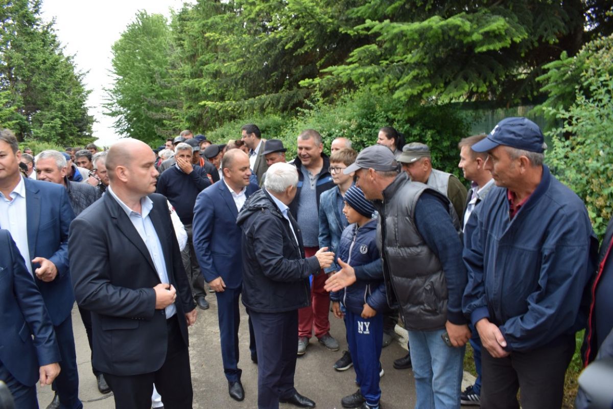 Odată ajuns, flancat de prefect și parlamentari PSD, Petre Daea a pășit hotărât către oamenii care-l așteptau, a rupt o bucată din colac și a refuzat țuica oferită insistent de gazde.