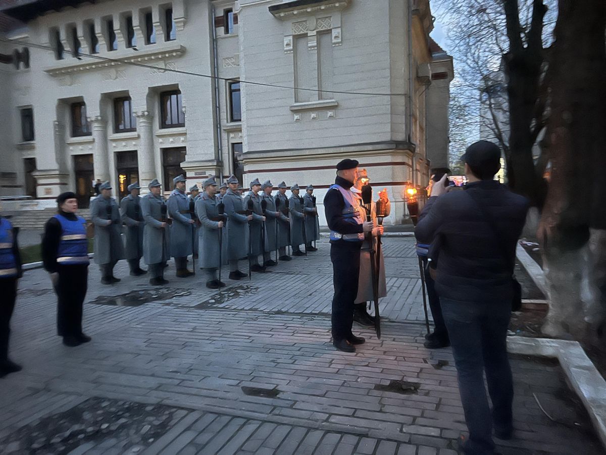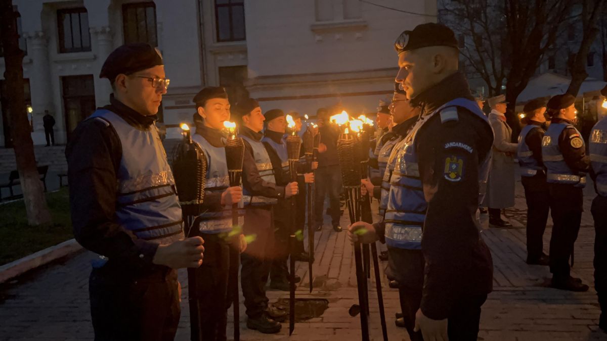 Două plutoane de jandarmi s-au încolonat înainte de ora anunțată având torțele în mâini. Fix la ora 20:00, sub comandă acestea au fost aprinse după care s-a pornit în defilare, vocile jandarmilor împletindu-se în cântece militare de marș.