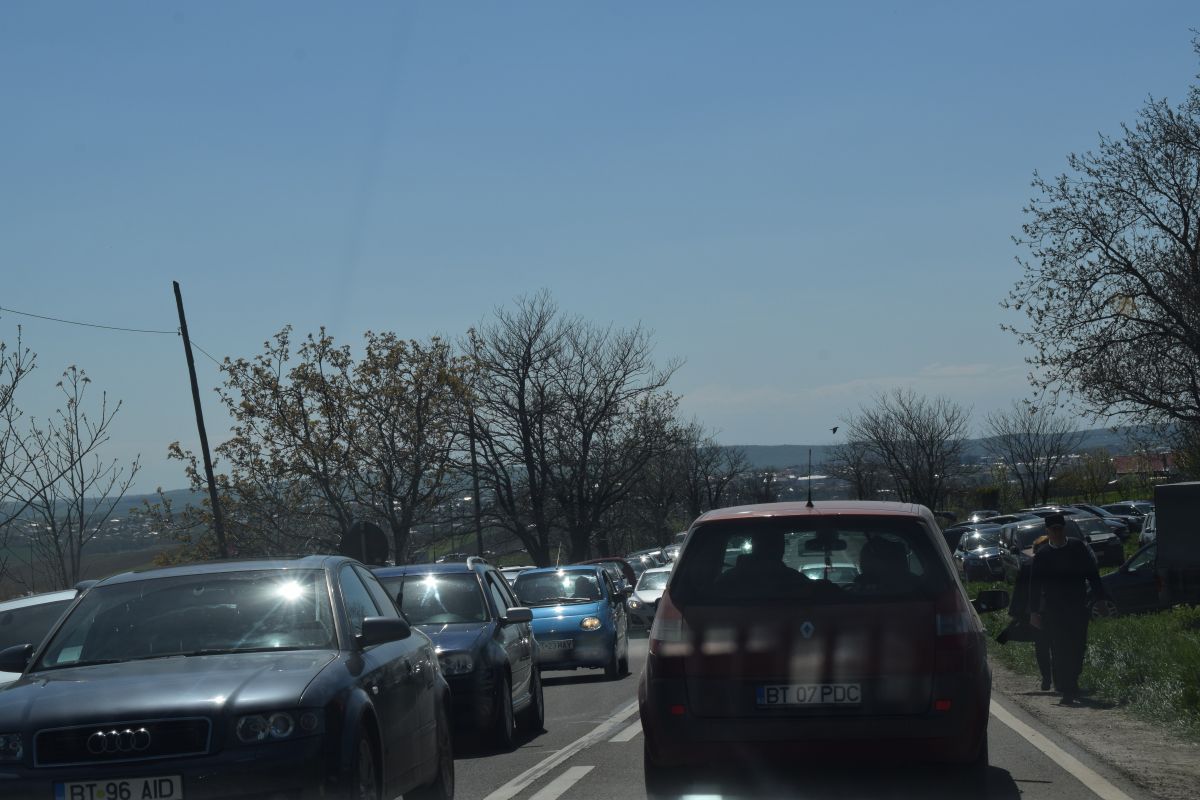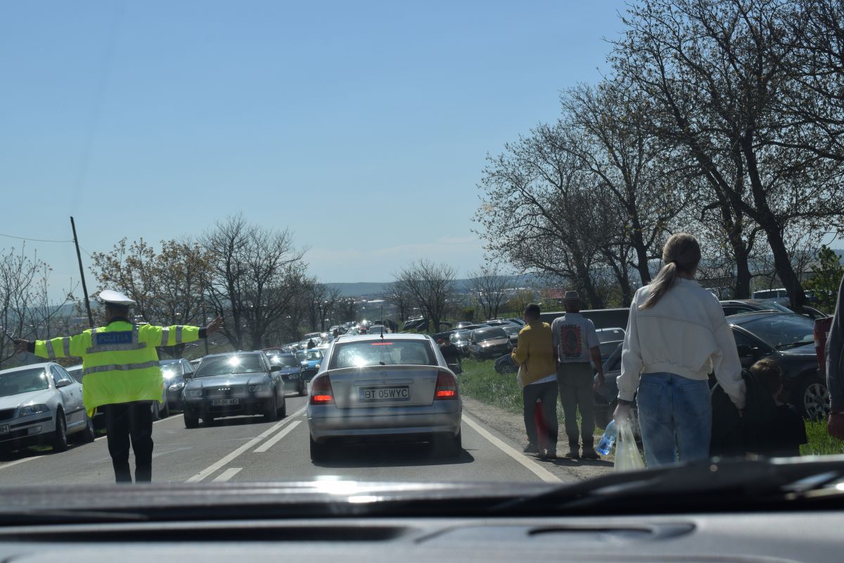 Drumul național este aglomerat de autoturisme iar polițiștii abia fac față cu dirijarea traficului.