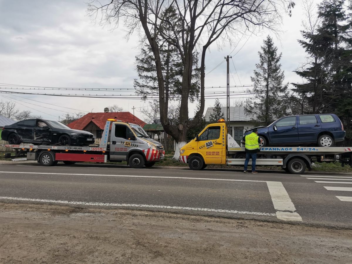 Cele două mașini au fost luate pe platformă de echipajele SOS Savencu.