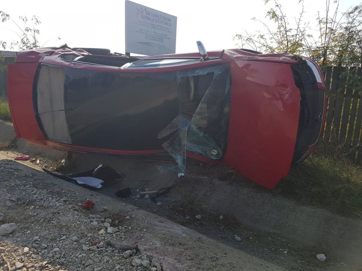 ULTIMĂ ORĂ: Impact puternic între două mașini, VW răsturnat, trei adulți și un copil răniți GRAV – FOTO & VIDEO