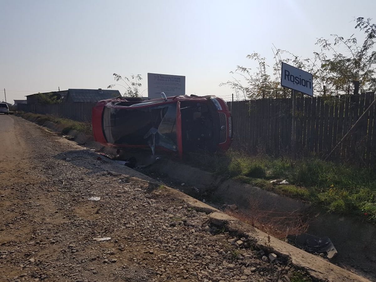 Două autoturisme s-au ciocnit puternic, una dintre mașini fiind răsturnată în șanțul de pe marginea drumului și distrusă aproape în totalitate.