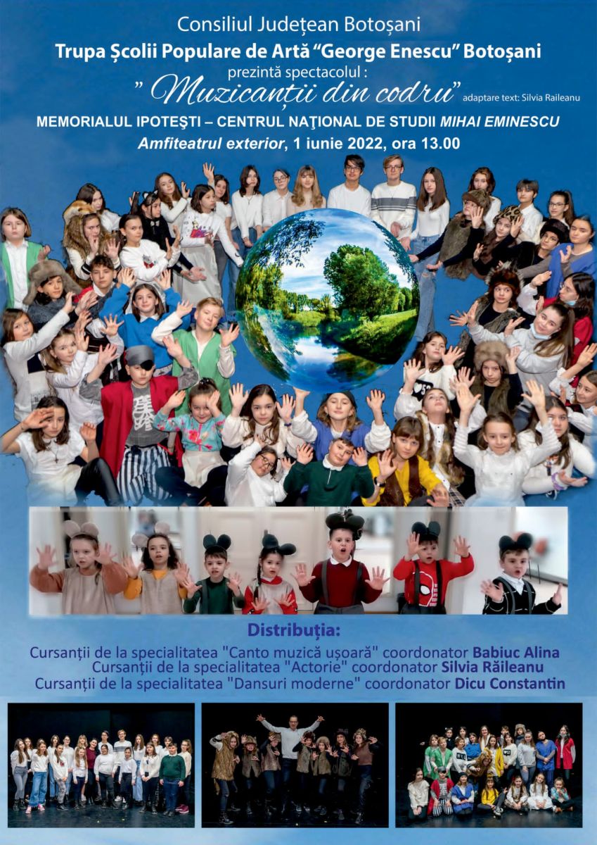 În data de 1 iunie 2022, Memorialul Ipoteşti – Centrul Naţional de Studii „Mihai Eminescu”, în parteneriat cu Trupa Şcolii Populare de Artă „George Enescu” Botoşani, aşteaptă publicul vizitator cu spectacolul „Muzicanţii din codru”, adaptare text după “Muzicanţii din Bremen”, de fraţii Grimm. Regia/ adaptare text: Răileanu Silvia. Mesajul spectacolului este, în această regie, şi unul intrigant ecologic, pe care spectatorii vor avea ocazia să-l descopere.