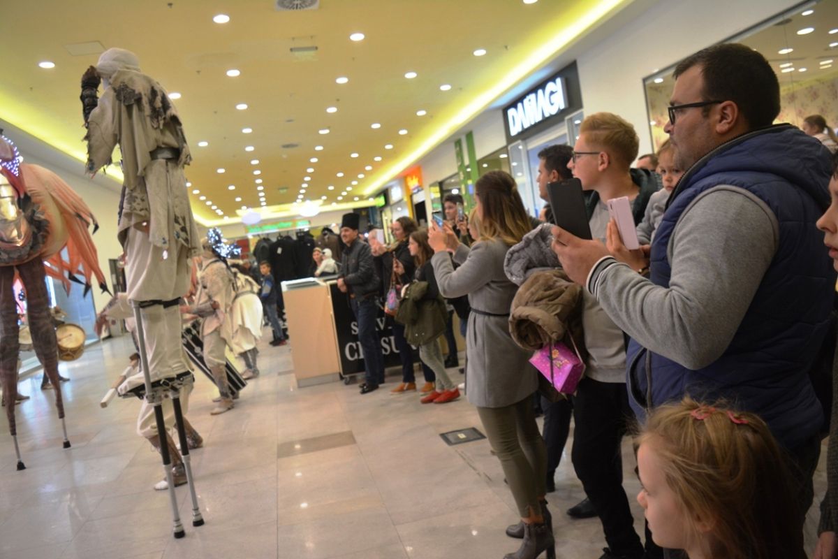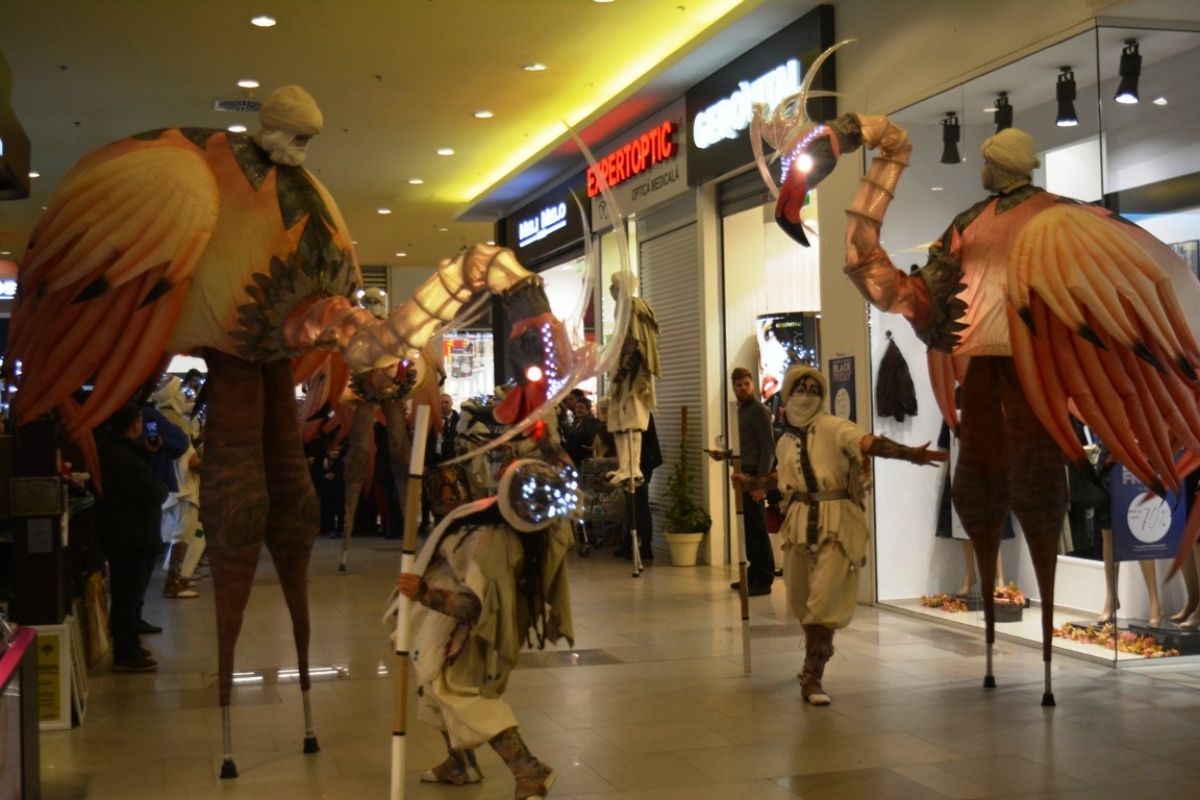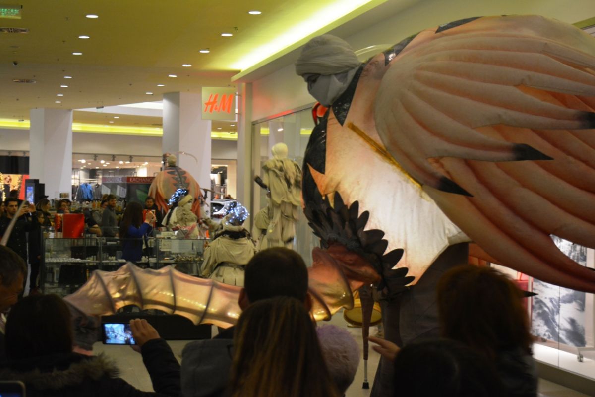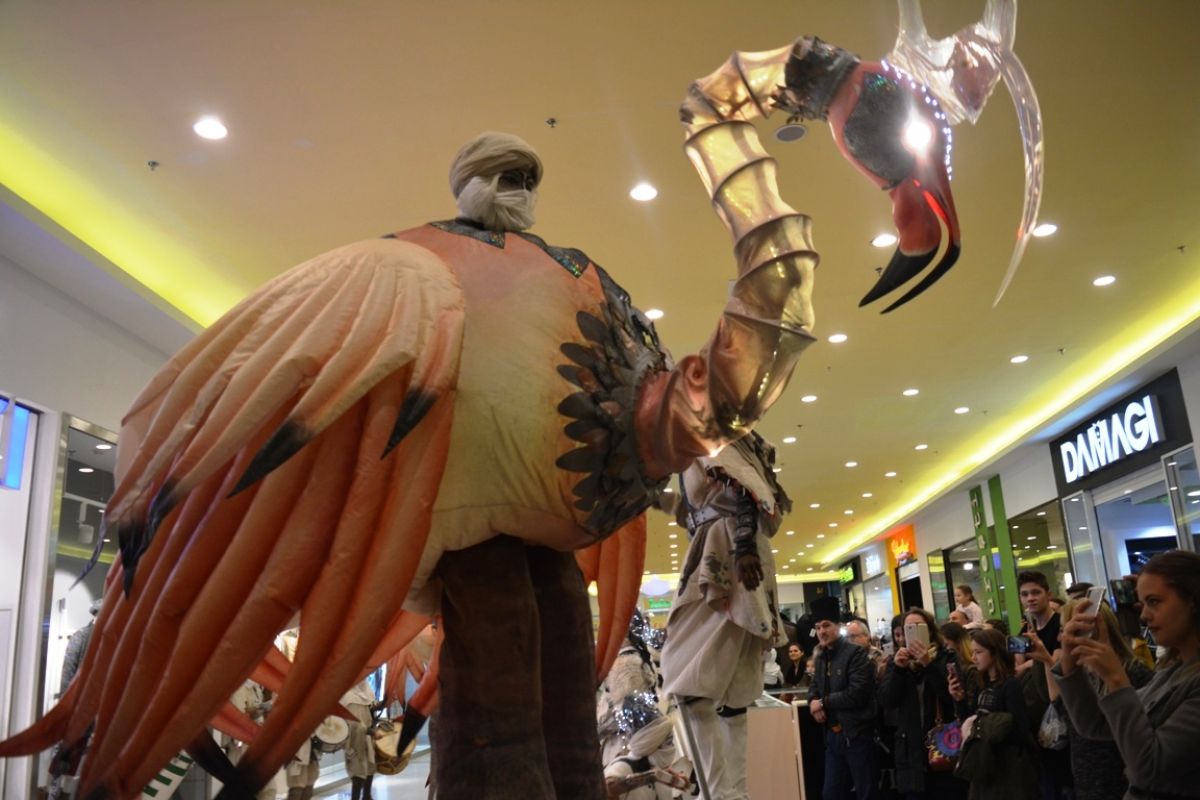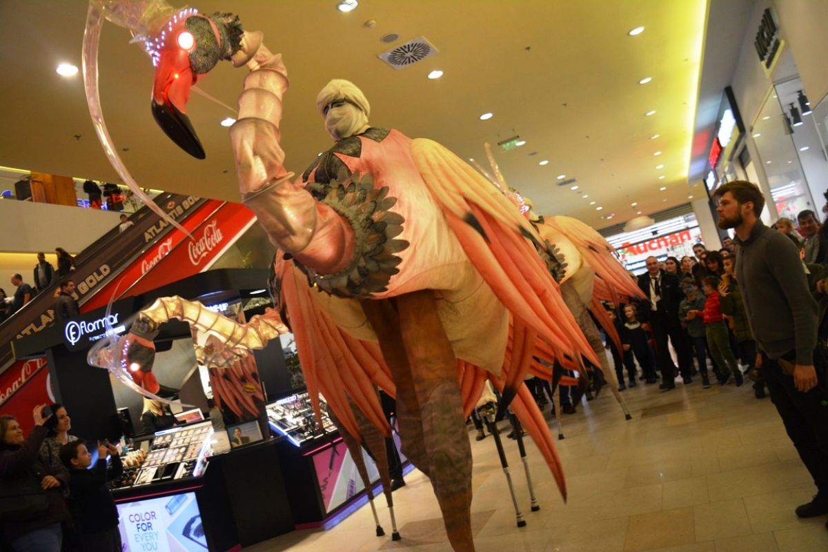 Trei păsări gigantice, oameni pe picioroange și o combinație aparte de dans, muzică și lumină au determinat sute de oameni, între care și o mulțime de botoșăneni, să îi urmeze în tot traseul lor prin centrul comercial.