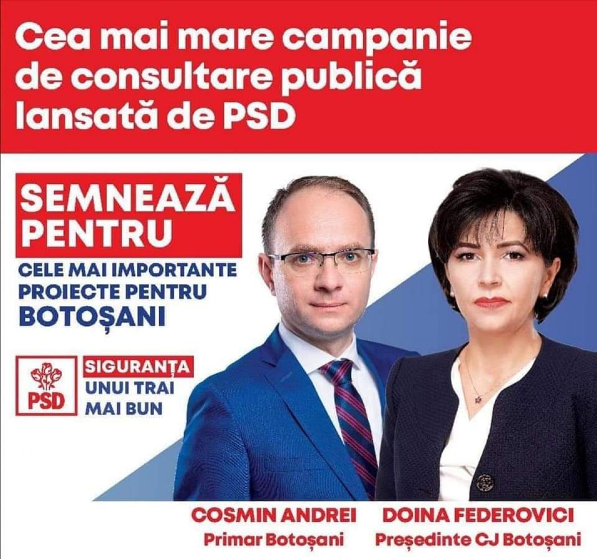 PSD Botoșani anunță că o dată cu începerea campaniei electorale pentru alegerile locale din 27 septembrie s-a încheiat consultarea publică prin care peste 100.000 de cetățeni și-au dat semnătura pentru proiectele de dezvoltare ale municipiului și județului Botoșani inițiate de Cosmin Andrei și Doina Federovici.