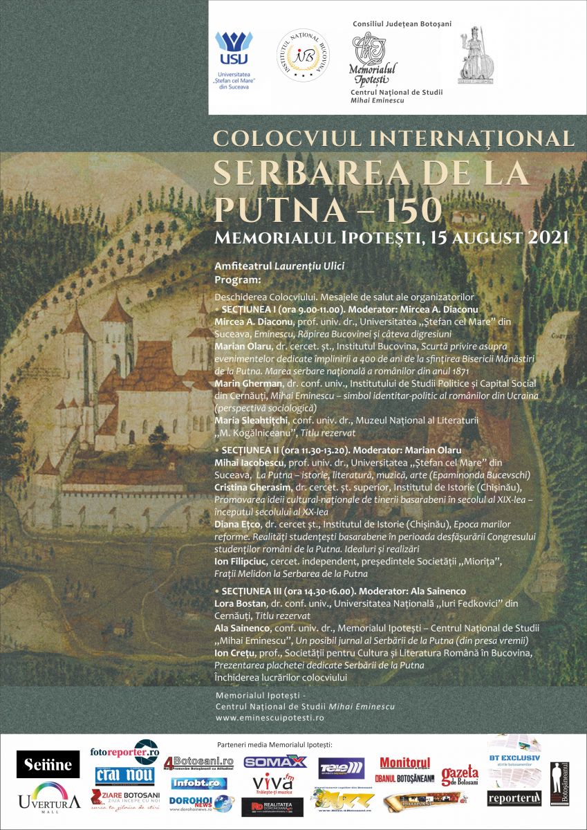 Memorialul Ipotești – Centrul Național de Studii „Mihai Eminescu”, Universitatea „Ștefan cel Mare” din Suceava, Institutul Bucovina Rădăuți și Societatea pentru Cultură și Literatură Română în Bucovina organizează, în data de 15 august 2021, colocviul internațional Serbarea de la Putna – 150.
