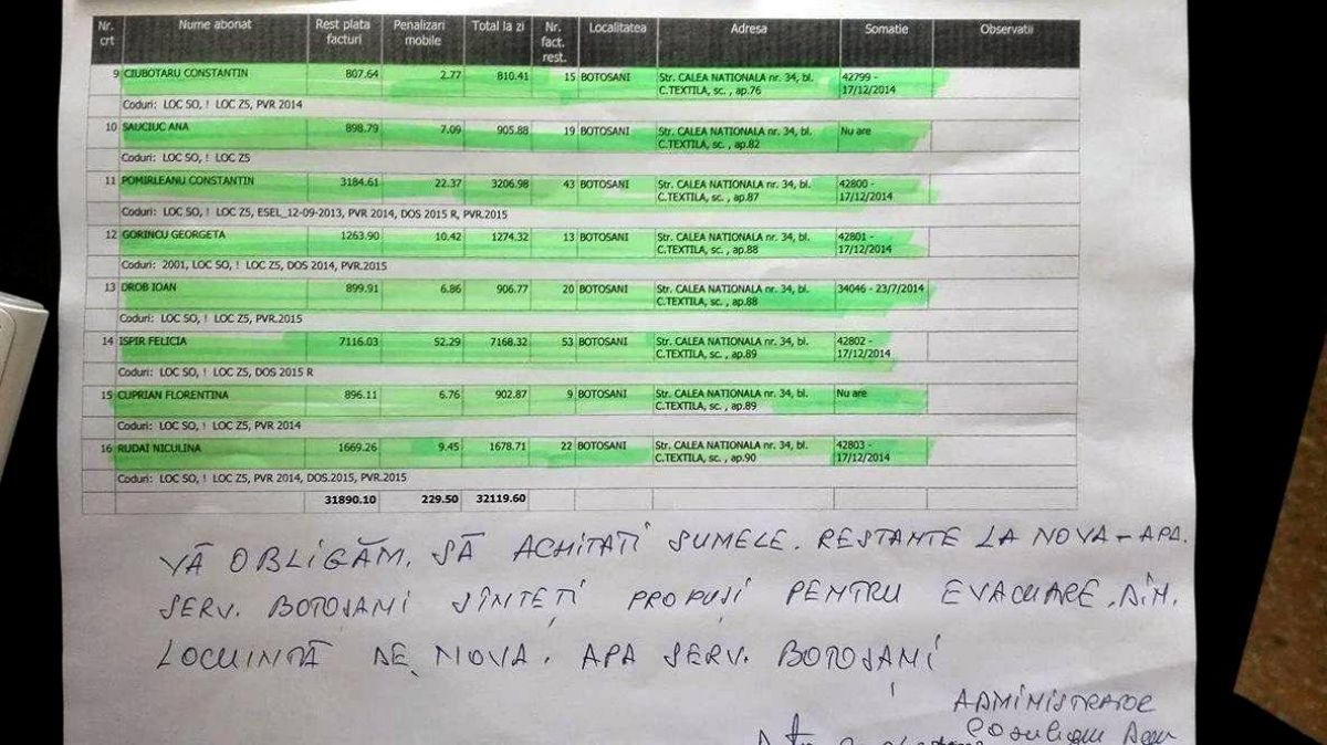 ”Vă rugăm să achitați sumele restante la Nova Apaserv. Sunteți propuși spre evacuare din locuință”, se arată în mesajul scris de mână în josul tabelelor.