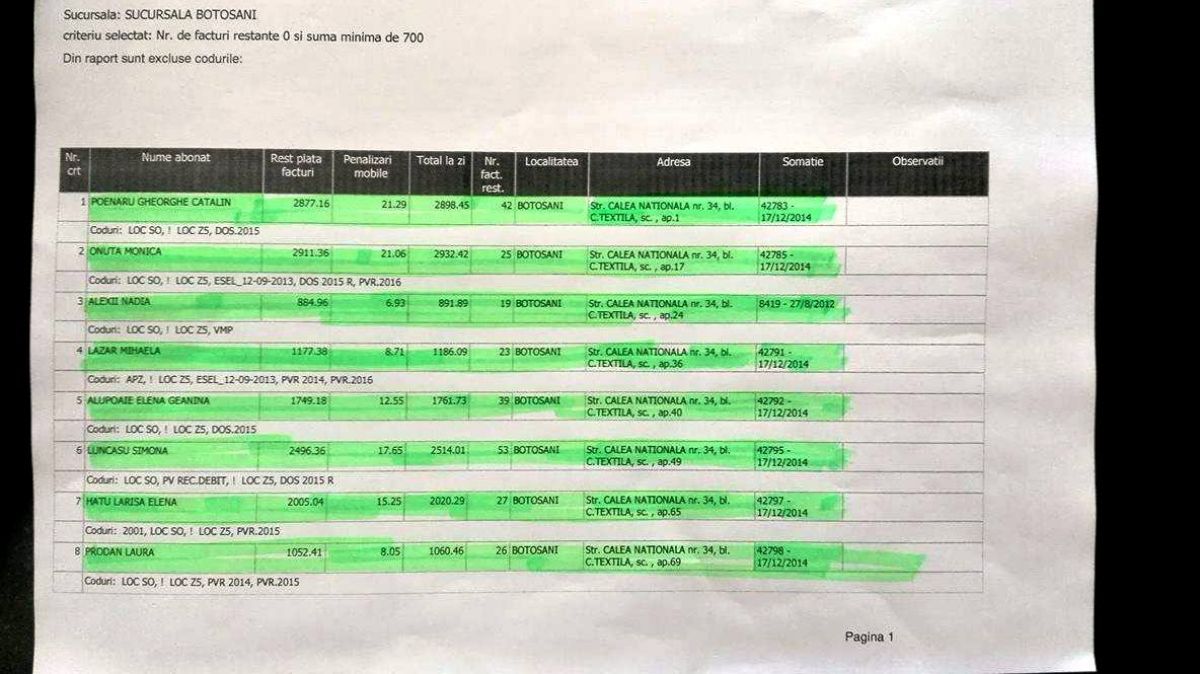 ”Am primit de la dl. administrator al SC Locativa tabelele cu primii 16 mari datornici din Căminul Textila, la SC Nova Apaserv. Din informațiile primite de dl. administrator care mi-a transmis să afișez aceste tabele le avizierul asociației din bloc, rezultă facturi neachitate de 54 de luni cel mai mult, suma cea mai mare 7.100 de lei”