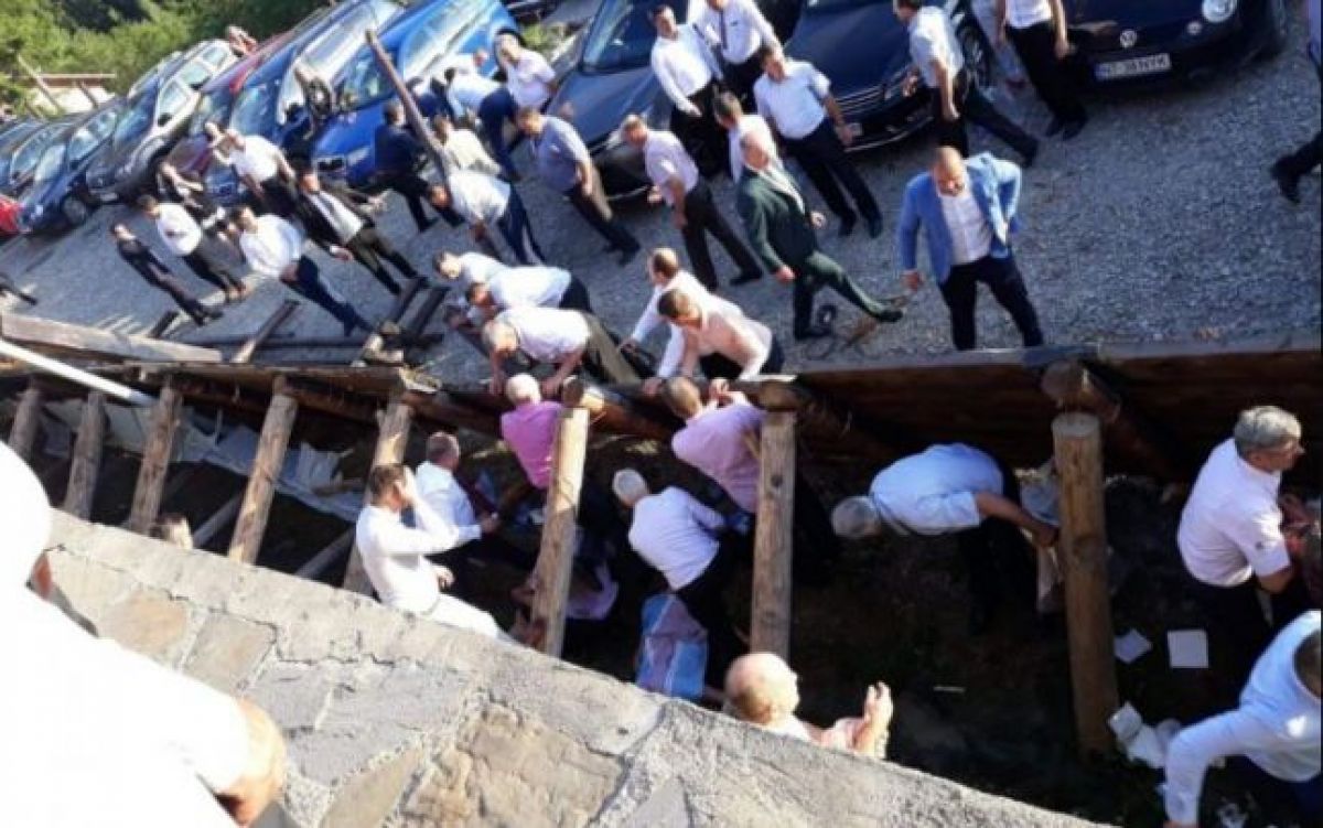 Adevărul arată că, în jur de 200 de participanţi aflaţi la petrecerea din salonul de nunţi al pensiunii Vânătorul s-au îngrozit atunci când o porţiune a terasei, construită din lemn, a cedat şi s-a prăbuşit sub greutatea oamenilor.