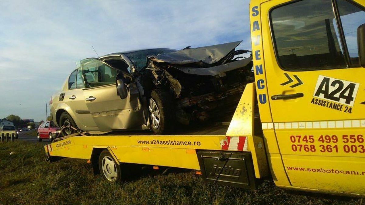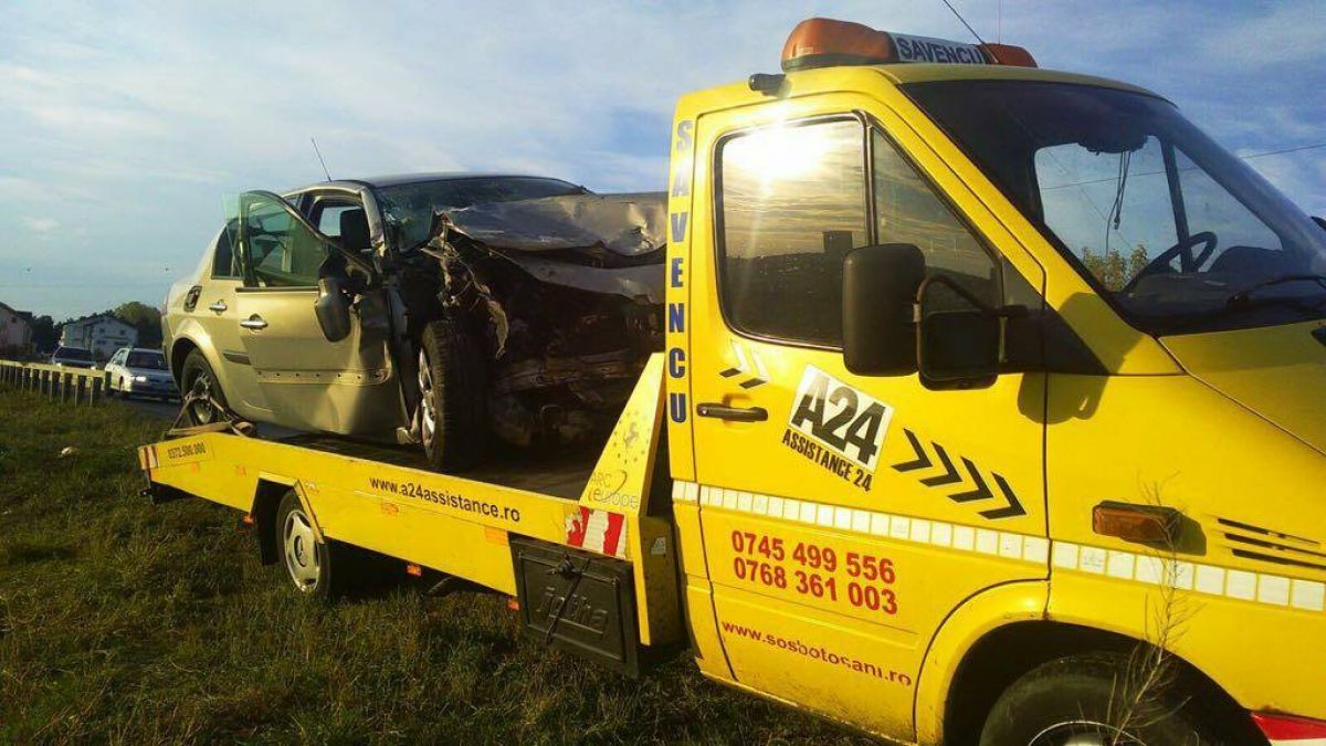 Autoturismul a rămas suspendat pe parapet, iar echipajul SOS Botoşani deplasat la faţa locului a avut nevoie de 20 de minute pentru a-l readuce pe şosea.