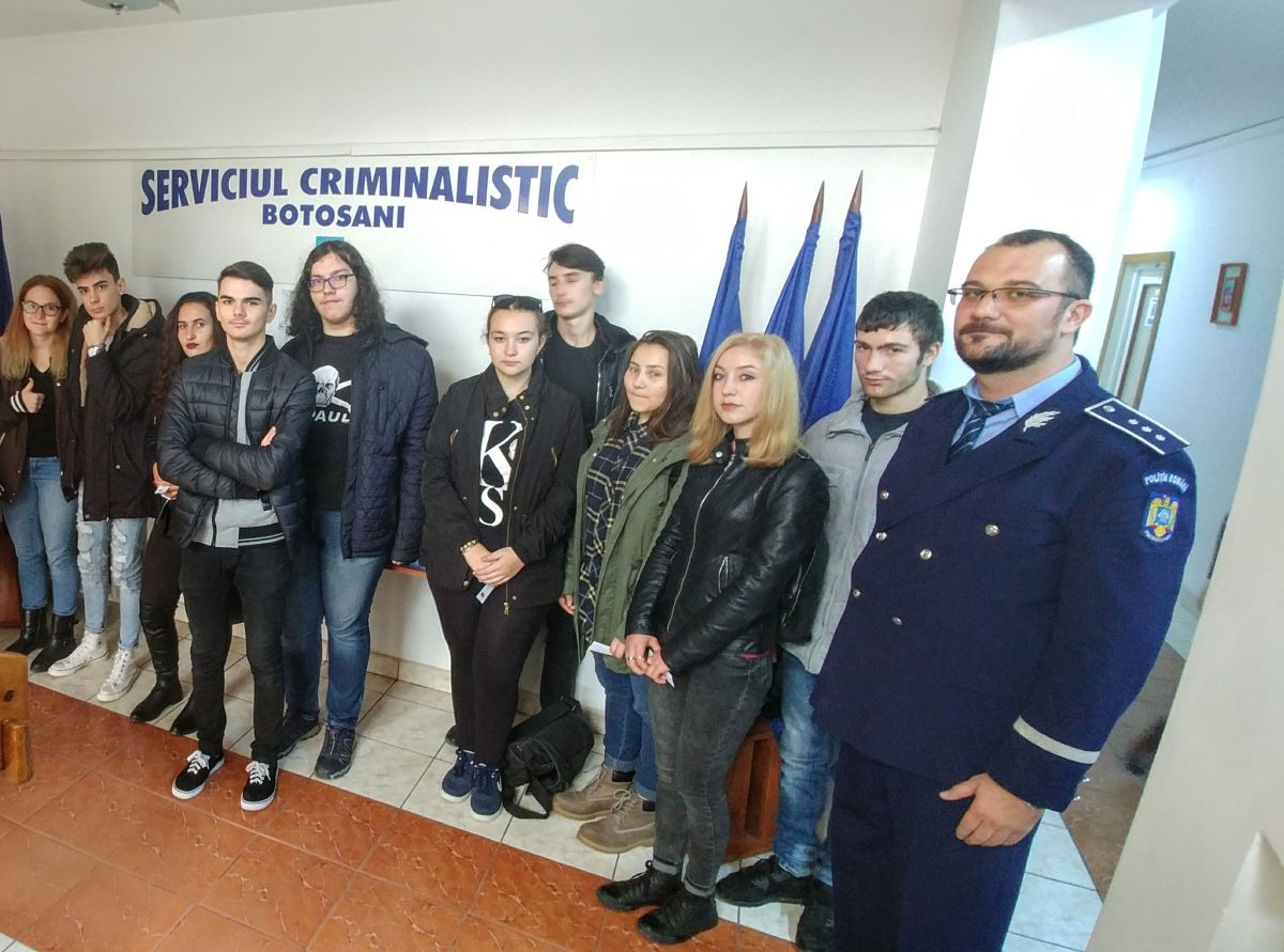 Gazdele elevilor au fost poliţiştii din cadrul Compartimentului de Analiză şi Prevenire a Criminalităţii – IPJ Botoşani, dar tinerii s-au întâlnit şi cu poliţiştii criminalişti, care le-au prezentat aspecte din activităţile, îndatoririle şi responsabilităţile de la locul de muncă.
