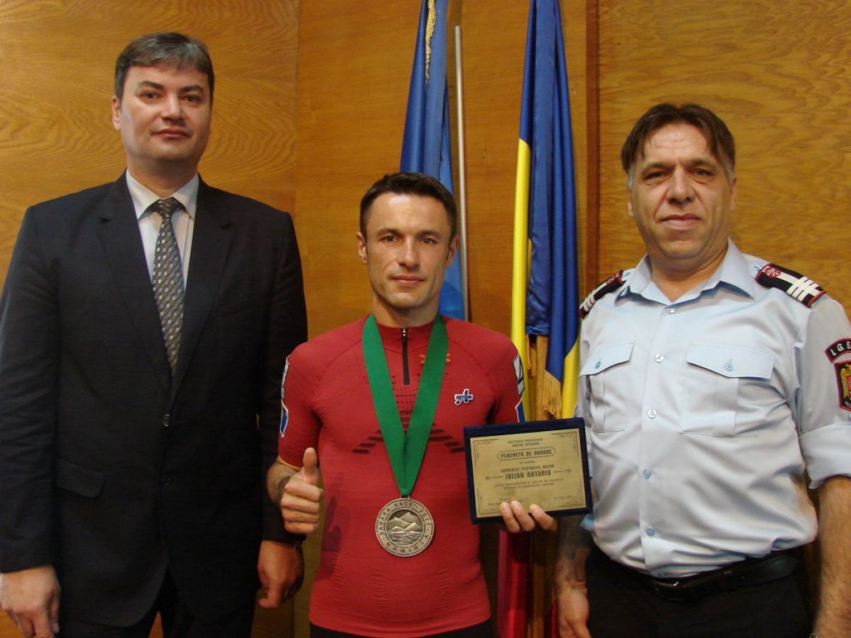 Pompierul Iulian Rotariu a primit o plachetă de onoare şi o diplomă de la prefect pentru rezultatul obţinut la ultramaraton.