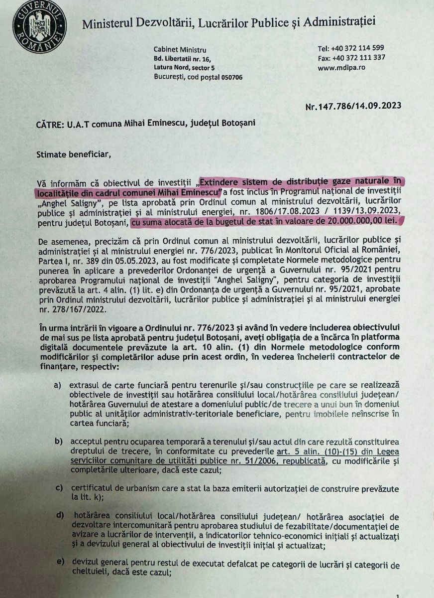 În următoarele zile, documentația tehnică împreună cu avizele necesare vor fi încărcate pe platforma Ministerului Dezvoltării, Lucrărilor Publice și Administrației și după semnarea contractului de finanțare, comuna Mihai Eminescu va scoate la licitație execuția lucrărilor pentru realizarea obiectivului de investiții.