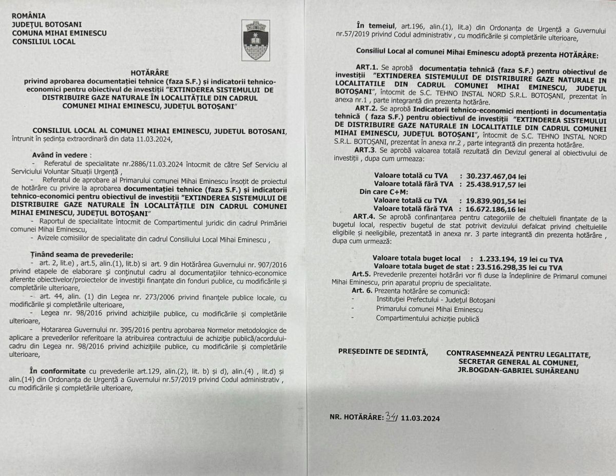 În cadrul ședinței Consiliului Local ce a avut loc ieri, 11 martie 2024, au fost aprobați indicatorii tehnico-economici în conformitate cu suma alocată din bugetul de stat și cerințele Programului National de Investiții “Anghel Saligny”, documentația tehnică - Studiu de Fezabilitate, precum și valoarea neeligibilă, necesară realizării investiției, ce va fi suportată din bugetul local.