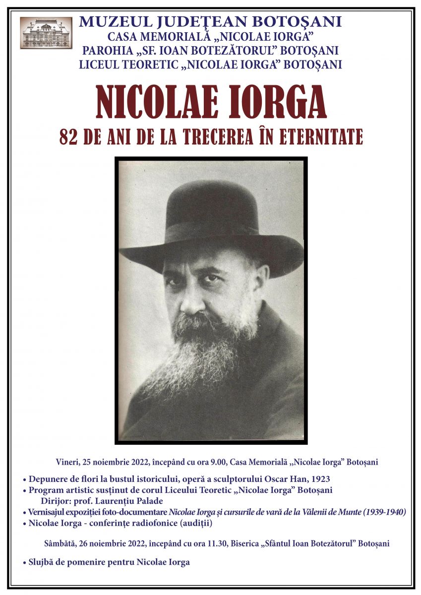Muzeul Judeţean Botoşani organizează, în zilele de 25 şi 26 noiembrie 2022, comemorarea a 82 de ani de la trecerea în eternitate a lui Nicolae Iorga.