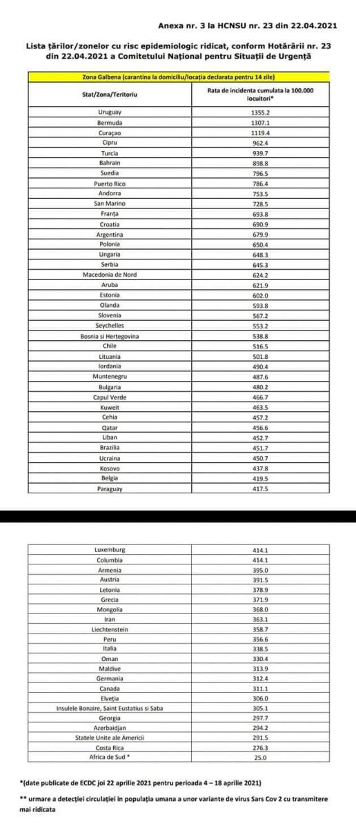 ZONĂ GALBENĂ (carantina la domiciliu/locația declarată) cuprinde următoarele țări / zone: