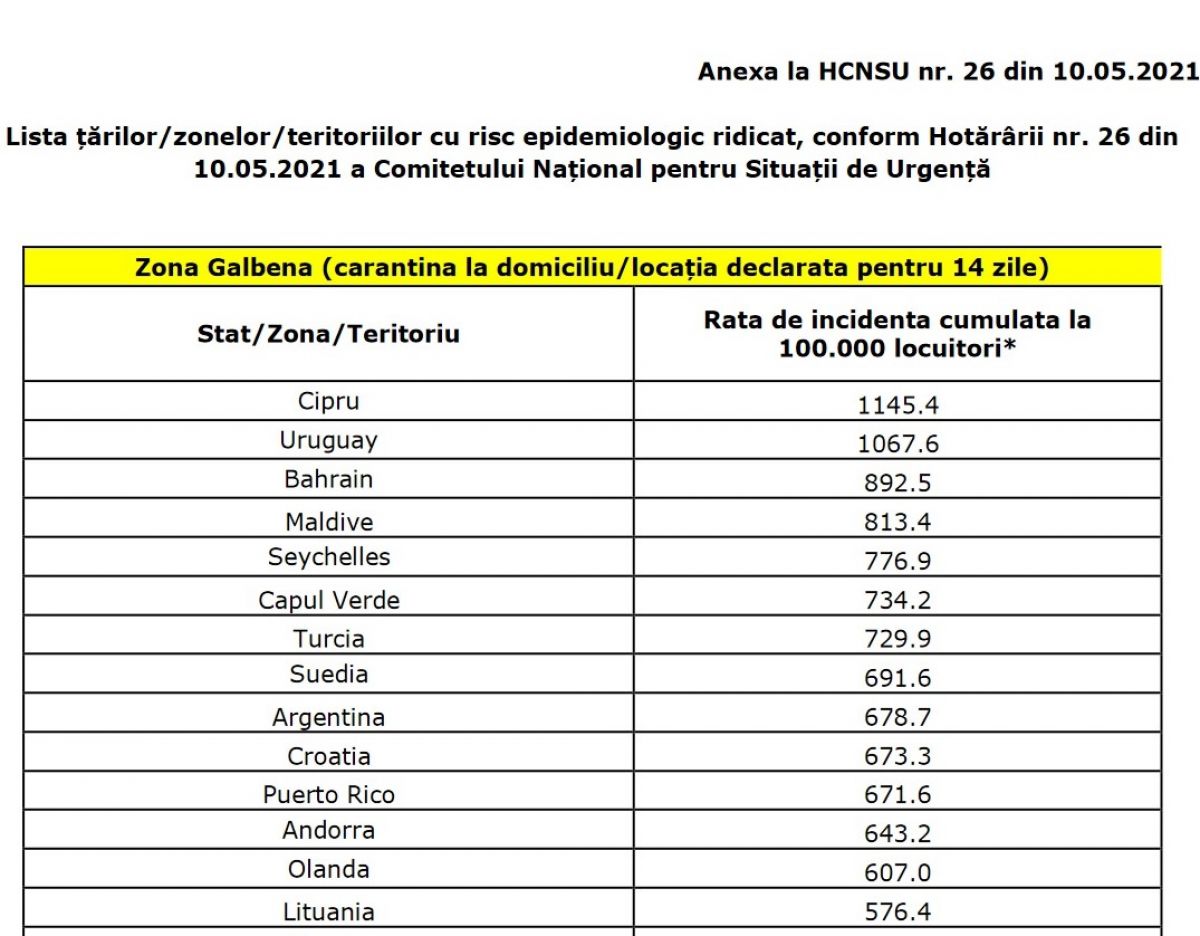 Astfel, potrivit Anexei 2 la Hotărârea CNSU 26/10.05.202, în zonă galbenă (carantină la domiciliu/locația declarată pentru 14 zile) se regăsesc Germania, Ungaria, Austria, Italia, Spania, ori Statele Unite ale Americii.