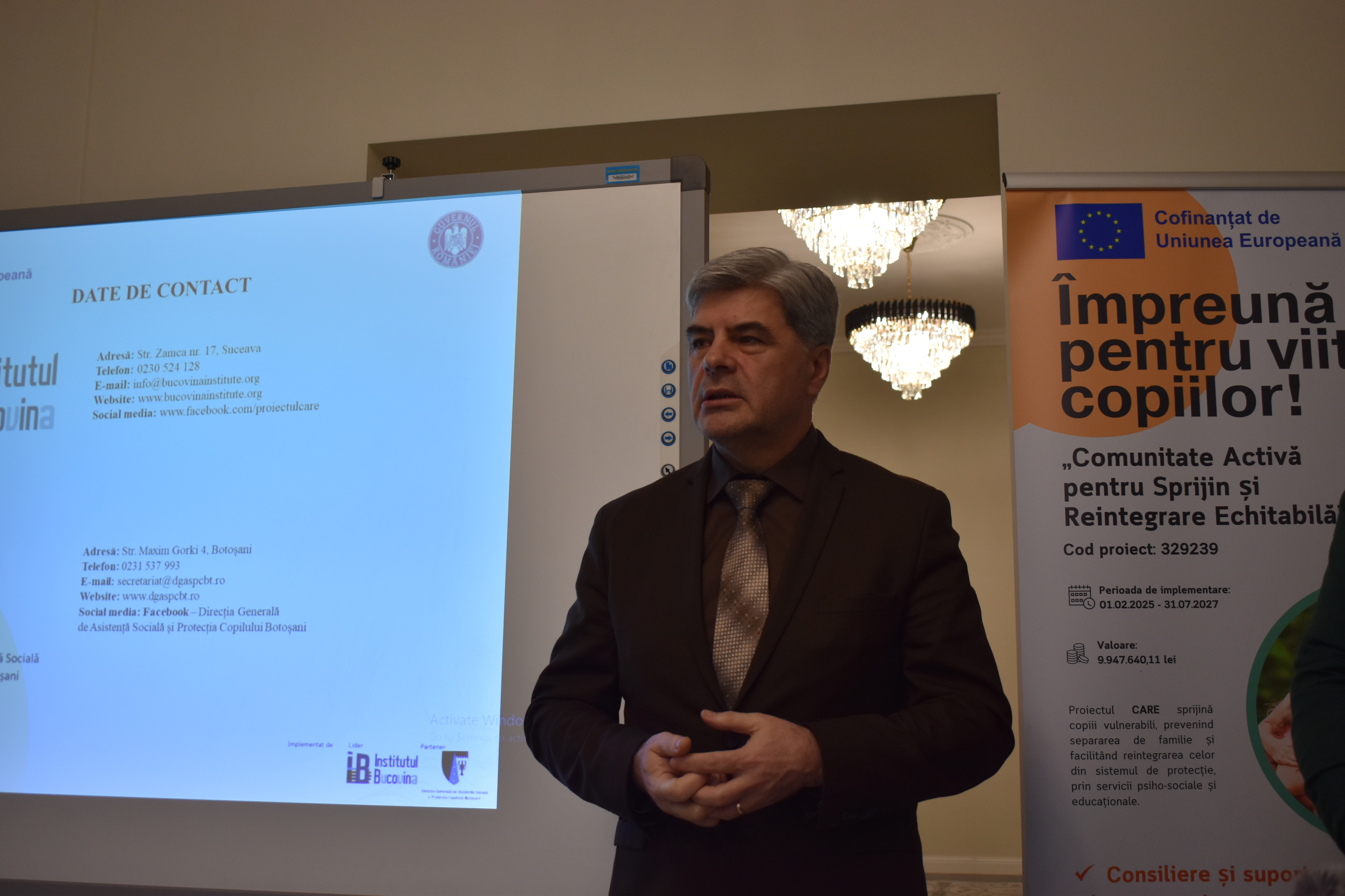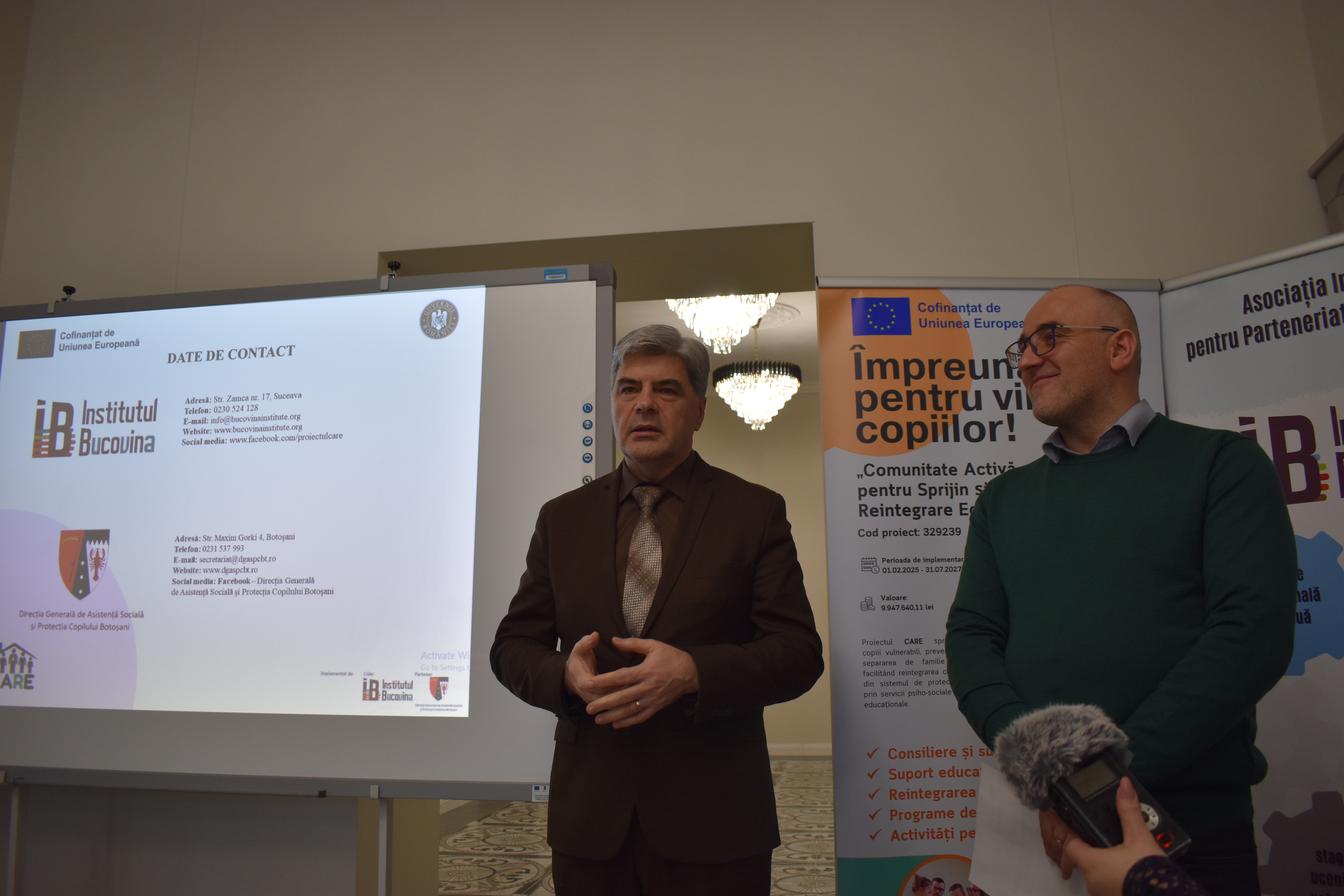 Proiectul, implementat de Asociația Institutul pentru Parteneriat Social Bucovina, are scopul de a preveni separarea de familie a 235 de copii aflați în situație de risc și de a sprijini reintegrarea în familie a 35 de copii care provin din sistemul de protecție specială.