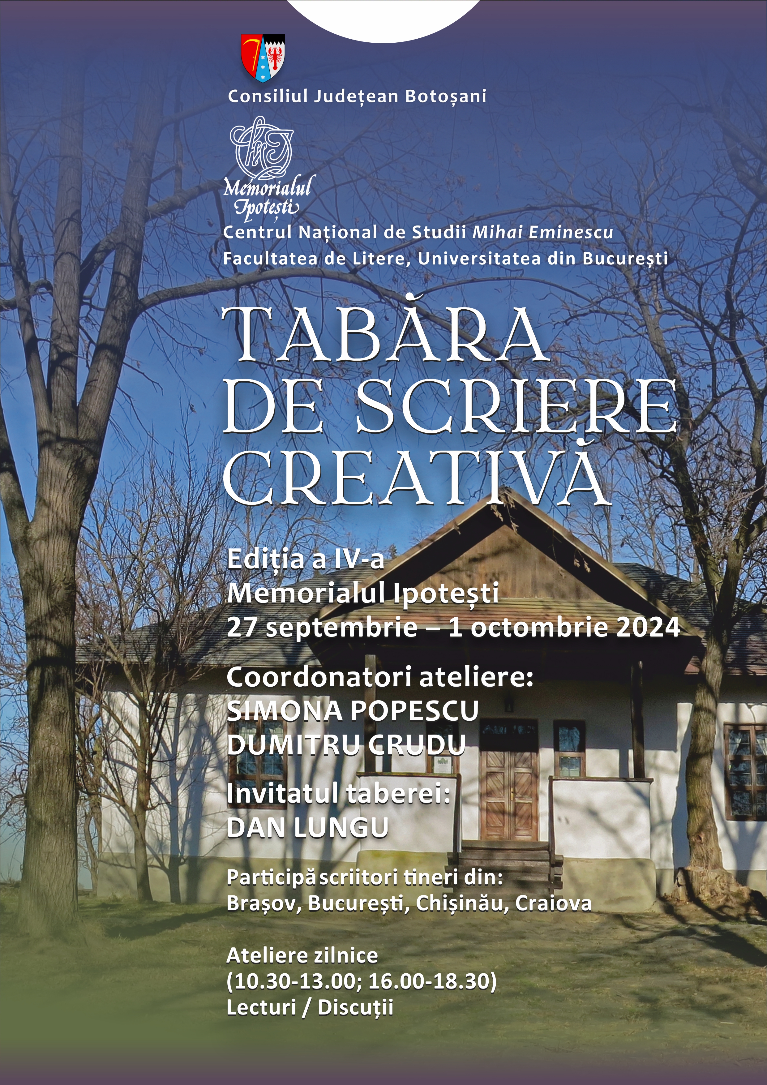 În perioada 27 septembrie – 1 octombrie 2024, la Memorialul Ipotești – Centrul Național de Studii „Mihai Eminescu”, instituție în subordinea Consiliului Județean Botoșani, va avea loc ediția a IV-a a Taberei de scriere creativă.