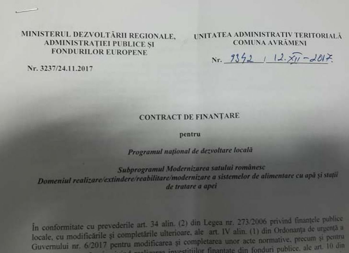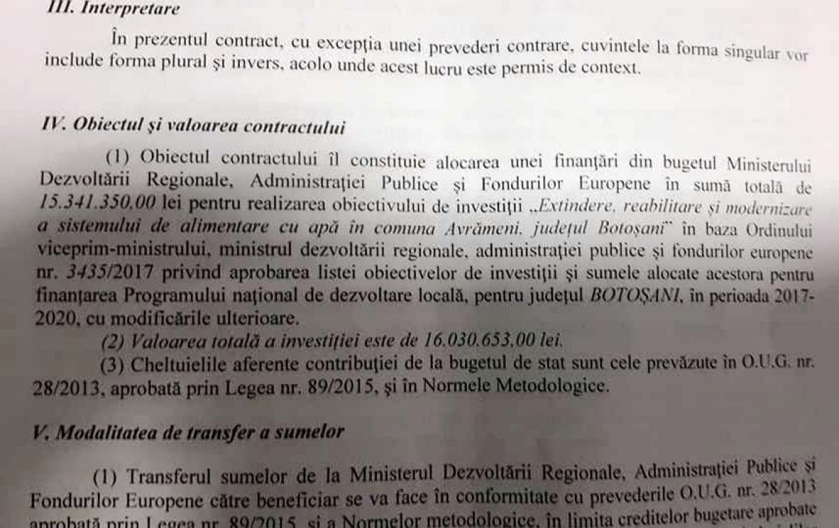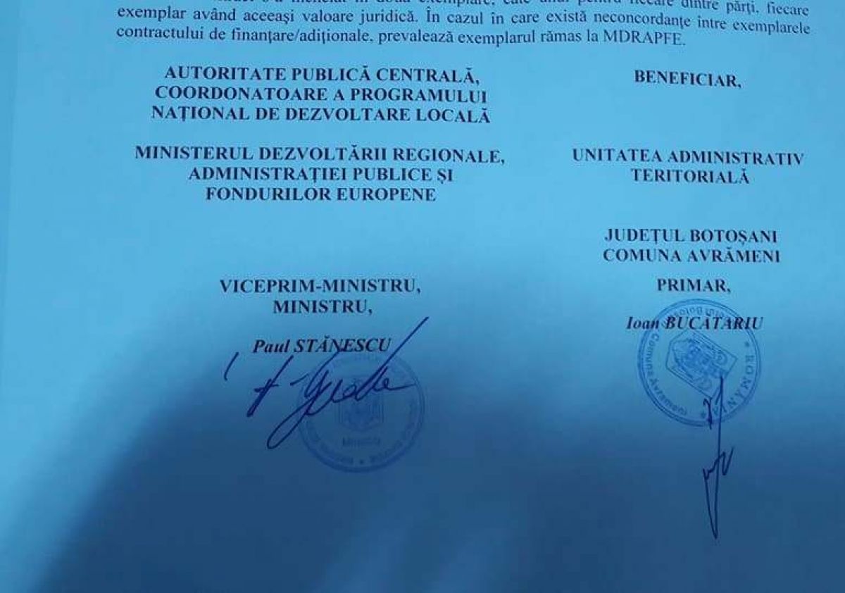 Actul a fost parafat de primarul de Avrămeni la Ministerul Dezvoltării Regionale, Administrației Publice și Fondurilor Europene (MDRAPFE) şi are o valoare totală de 15,3 milioane de lei.