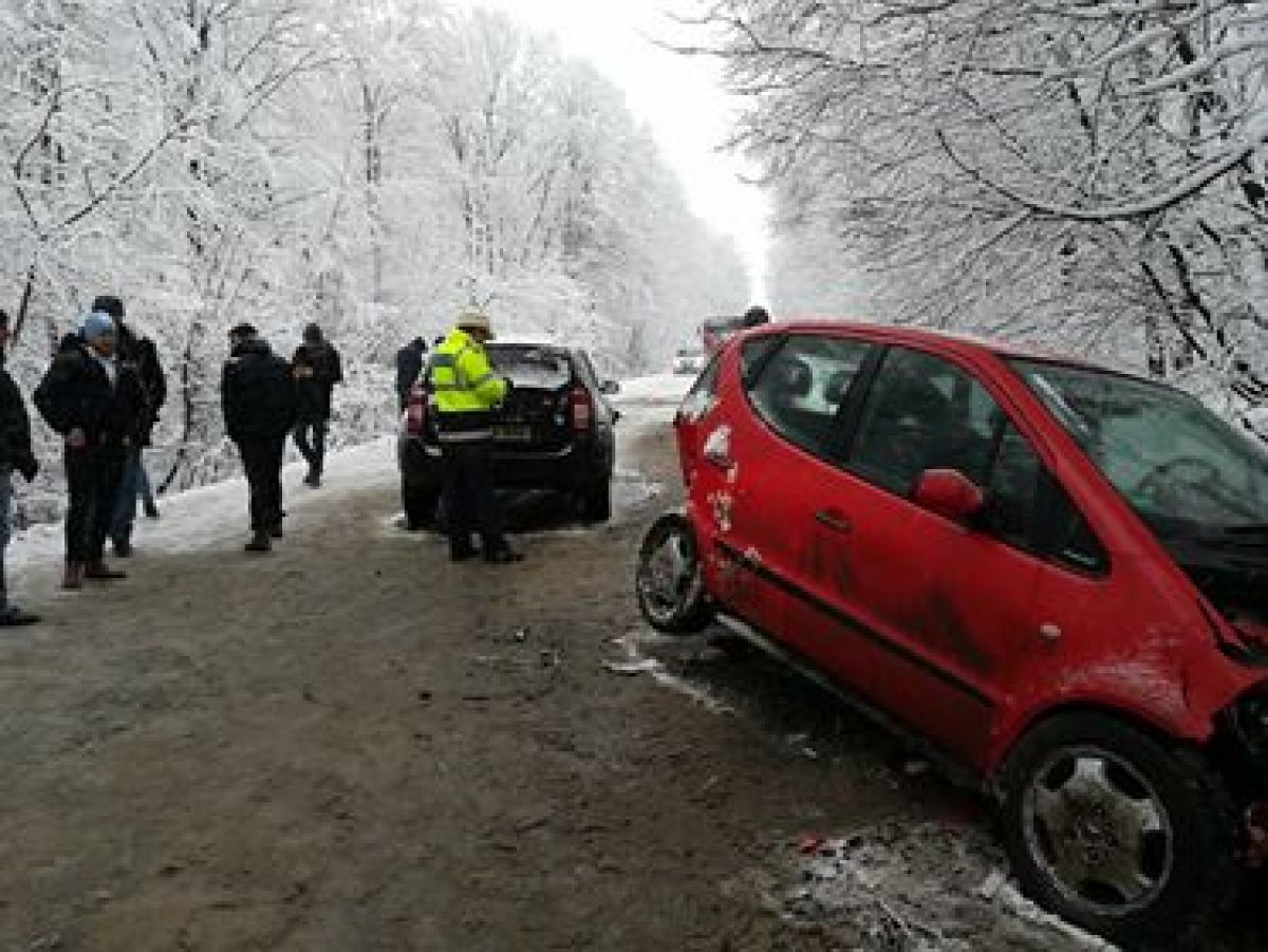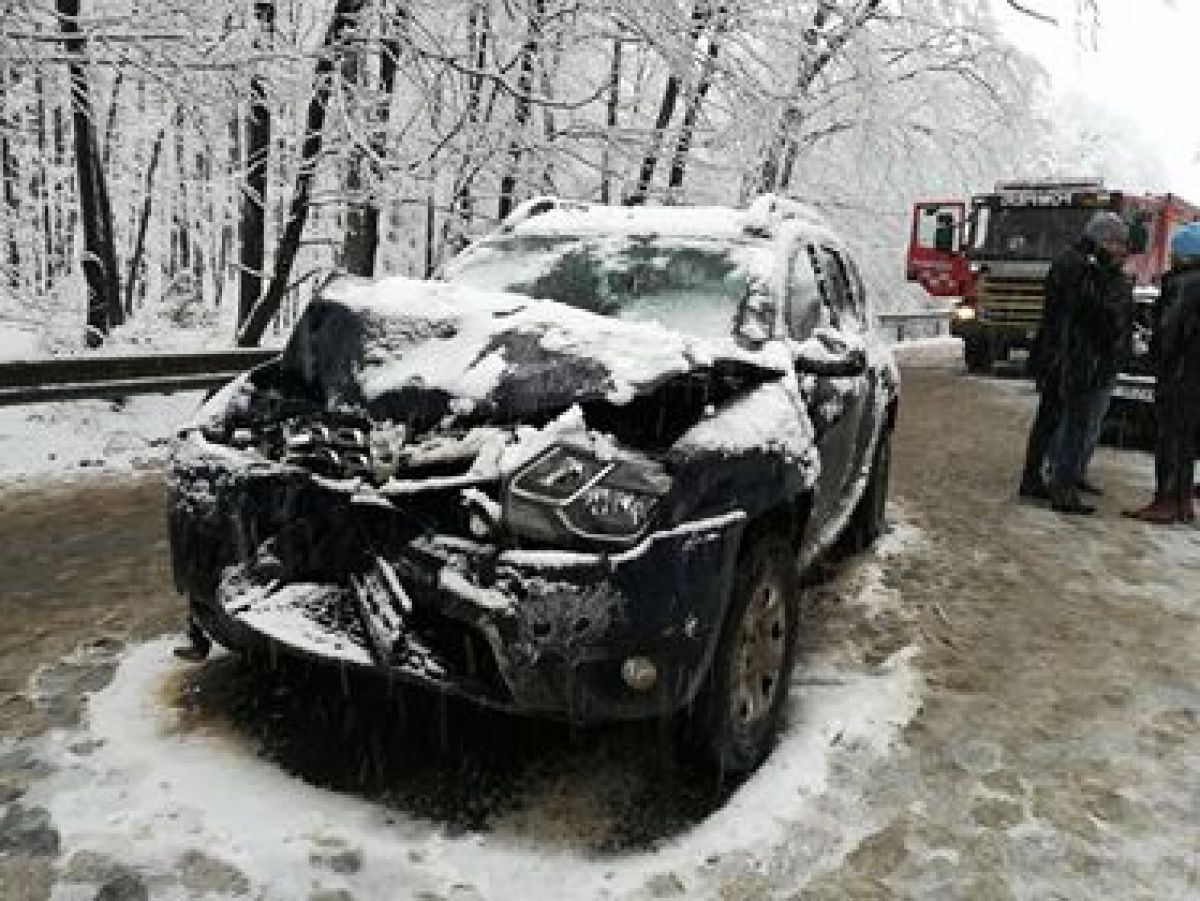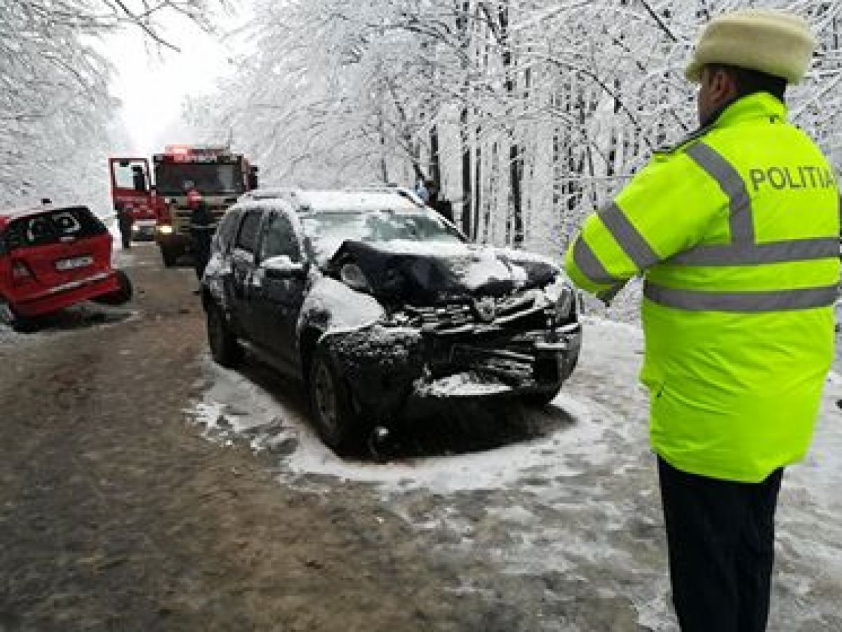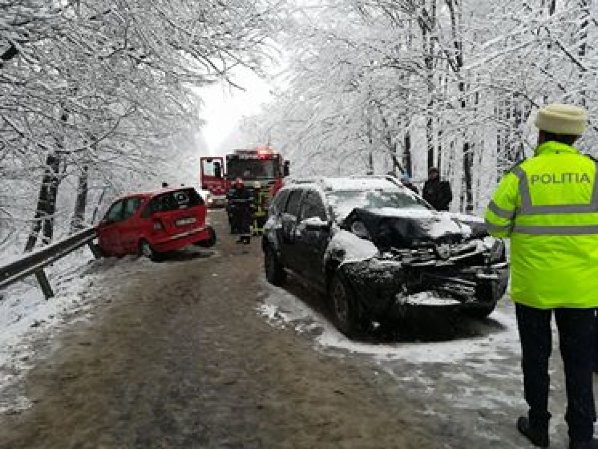 Este vorba despre un Mercedes, VW Gold și o Dacia Duster. Toate trei mașinile sunt grav avariate și se pare că accidentul a survenit după ce una dintre ele a derapat pe carosabilul acoperit cu zăpadă.