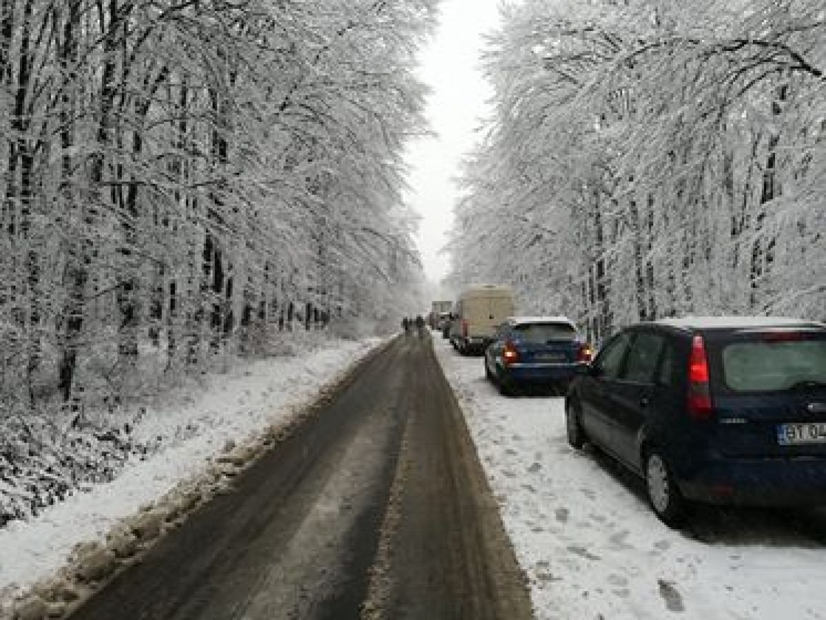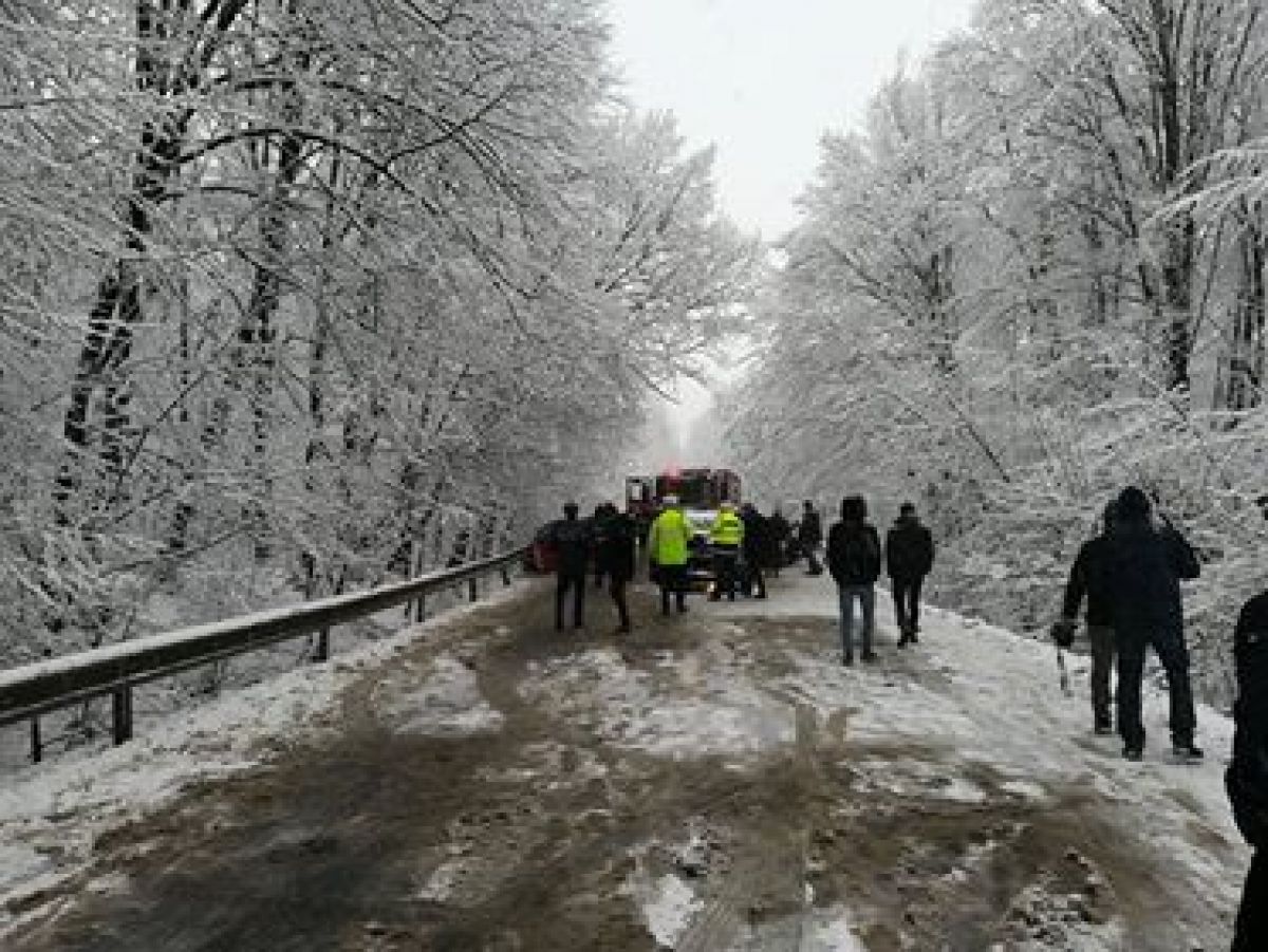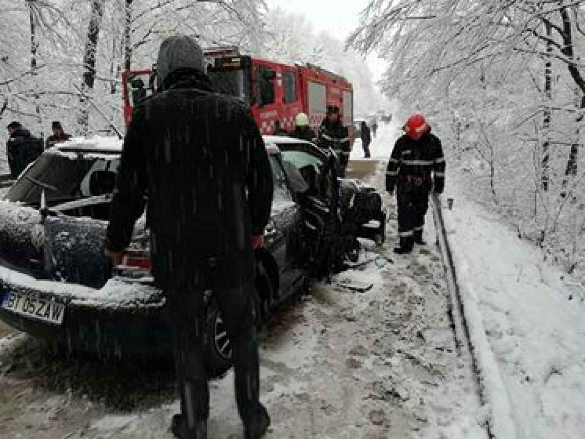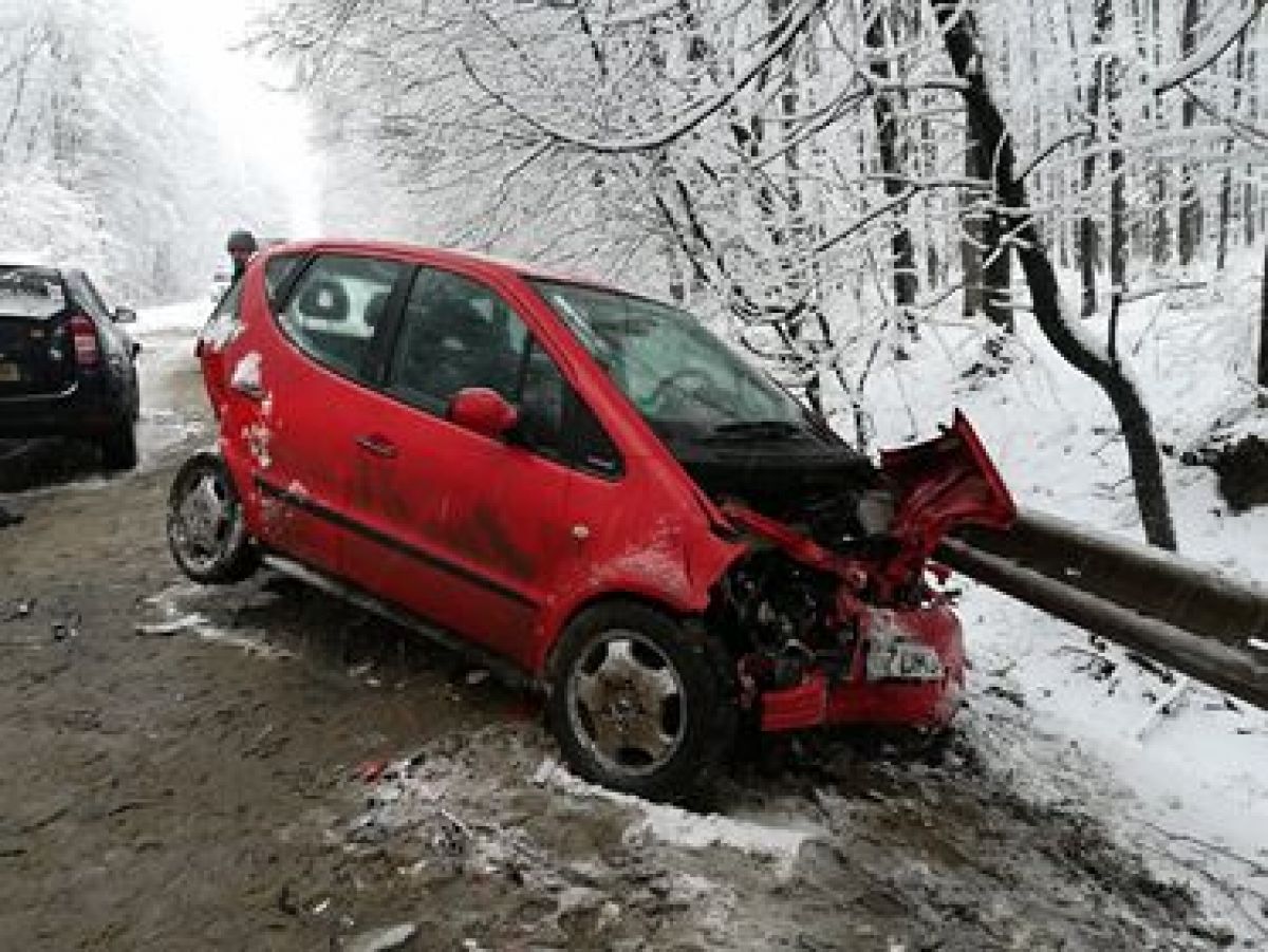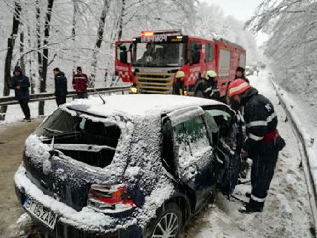 Este vorba despre un Mercedes, VW Gold și o Dacia Duster. Toate trei mașinile sunt grav avariate și se pare că accidentul a survenit după ce una dintre ele a derapat pe carosabilul acoperit cu zăpadă.