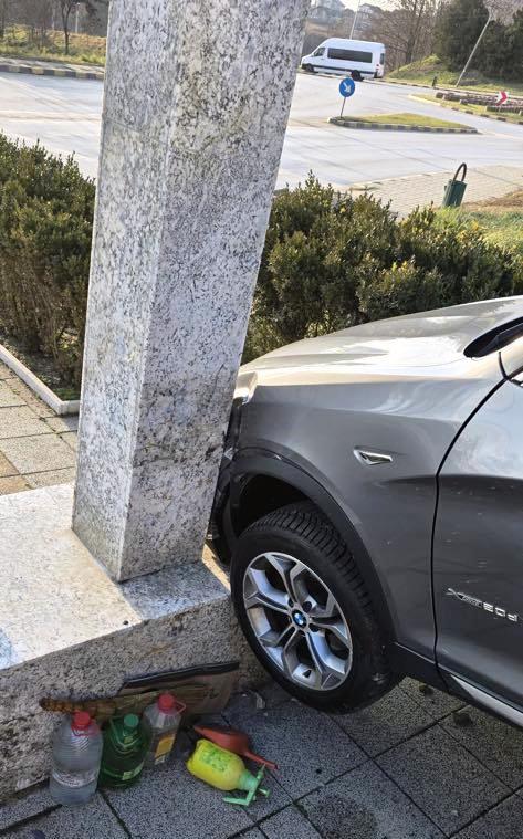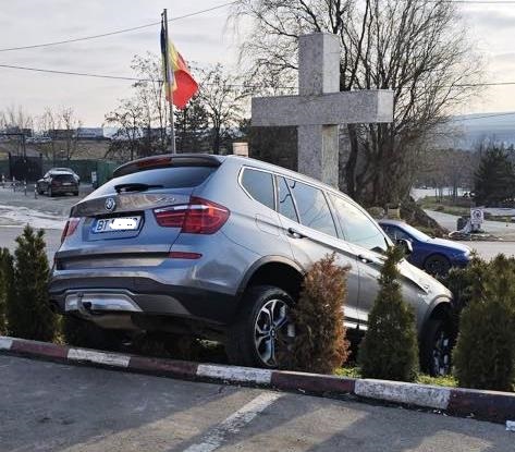 Autoturismul BMW X 3 a luat-o la vale, cei implicați nu au mai avut timp să reacționeze astfel încât s-a oprit în crucea construită pe marginea străzii.
