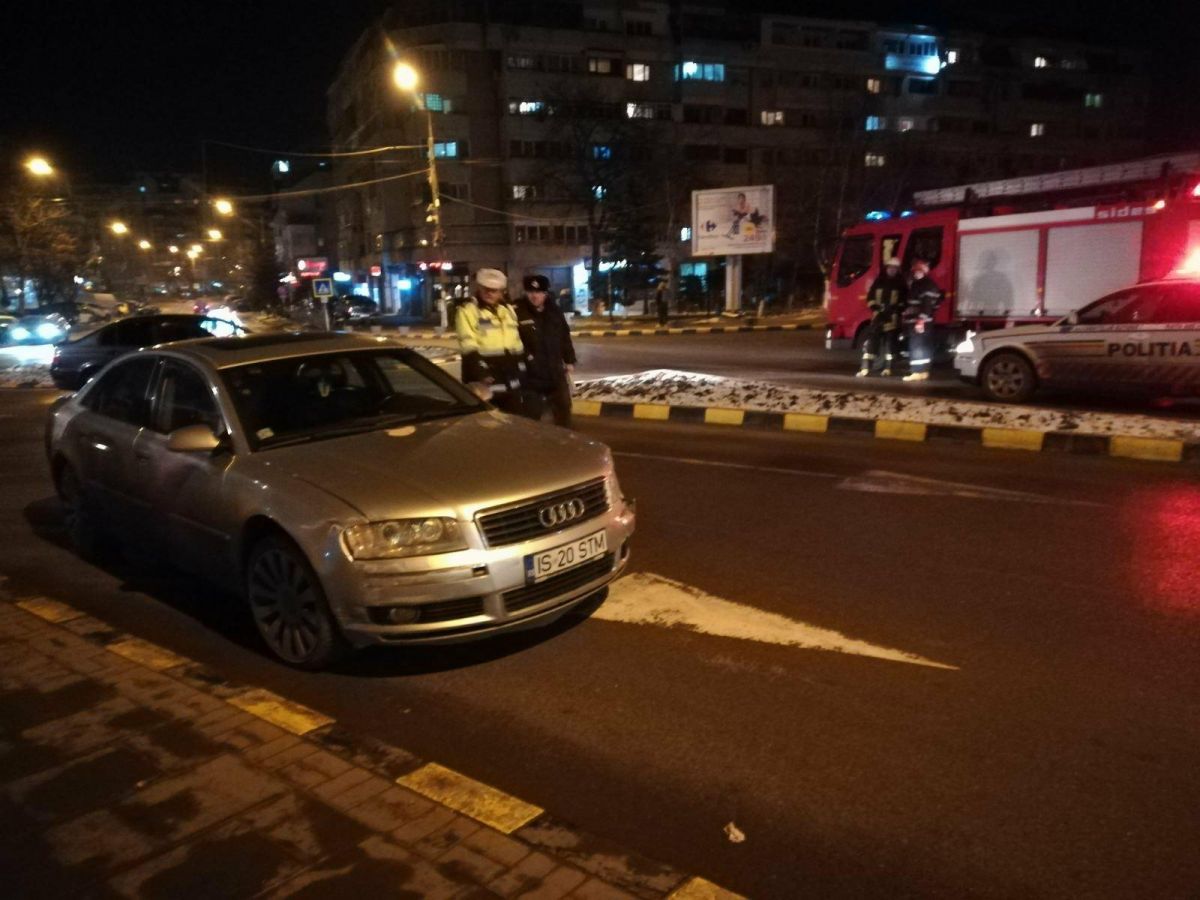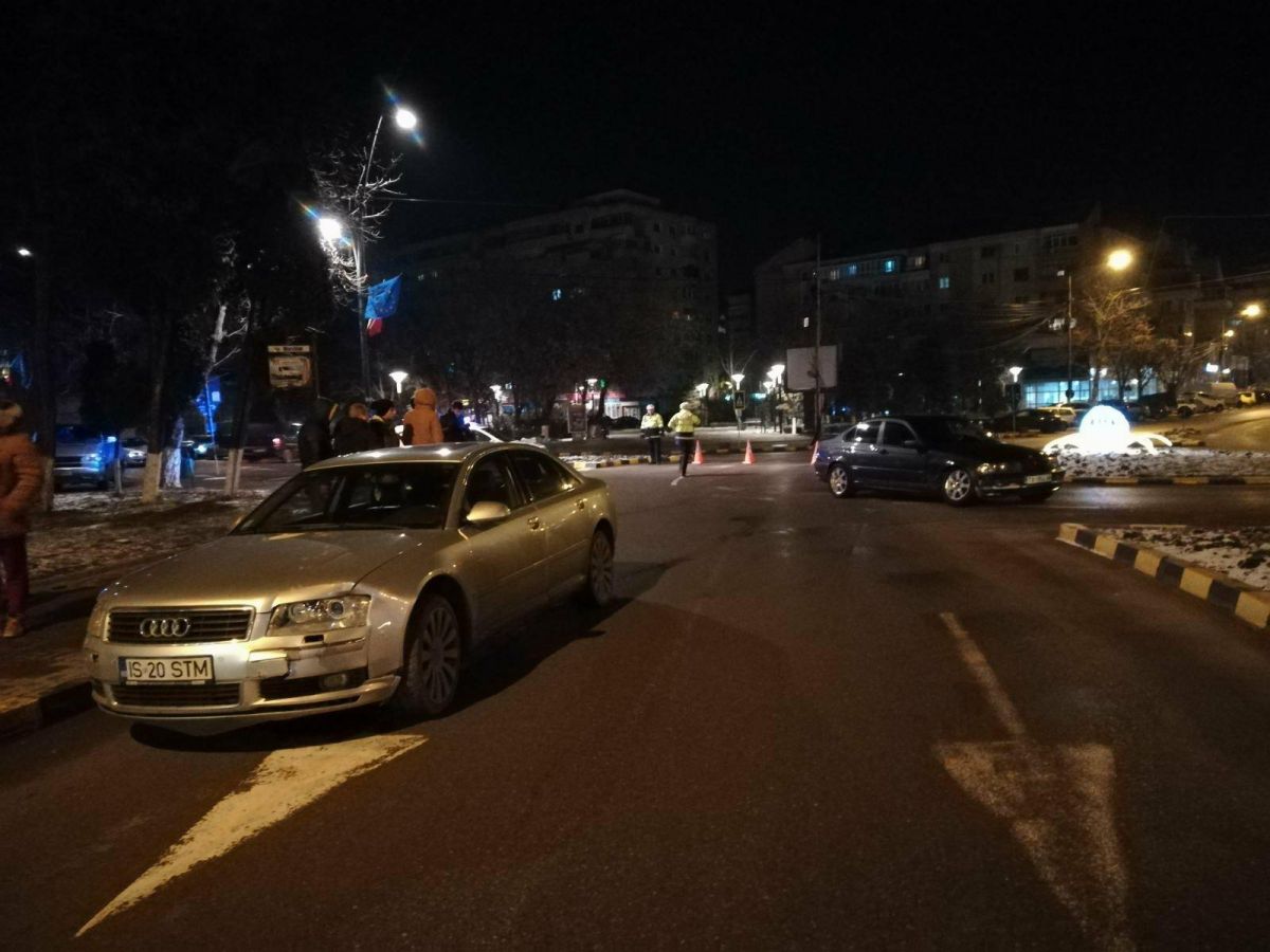 Un BMW care venea din direcţia Casei Căsătoriilor a încercat să facă stânga la sensul giratoriu, însă a fost lovit de un Audi înmatriculat la Iaşi şi care circula dinspre Hotel Rapsodia.