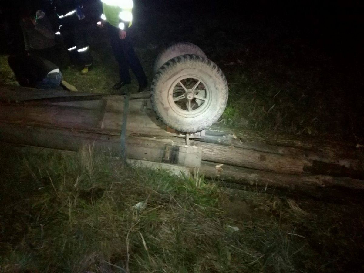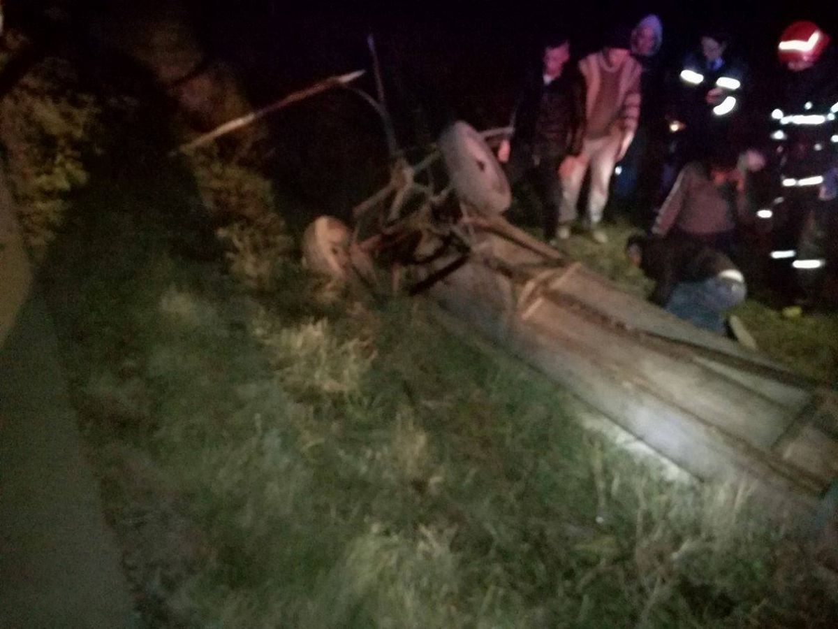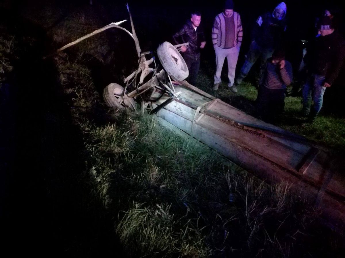 Acolo un bărbat a rămas captiv sub o căruță plină cu lemne care s-a răsturnat pe marginea drumului cel mai probabil din cauza greutății.