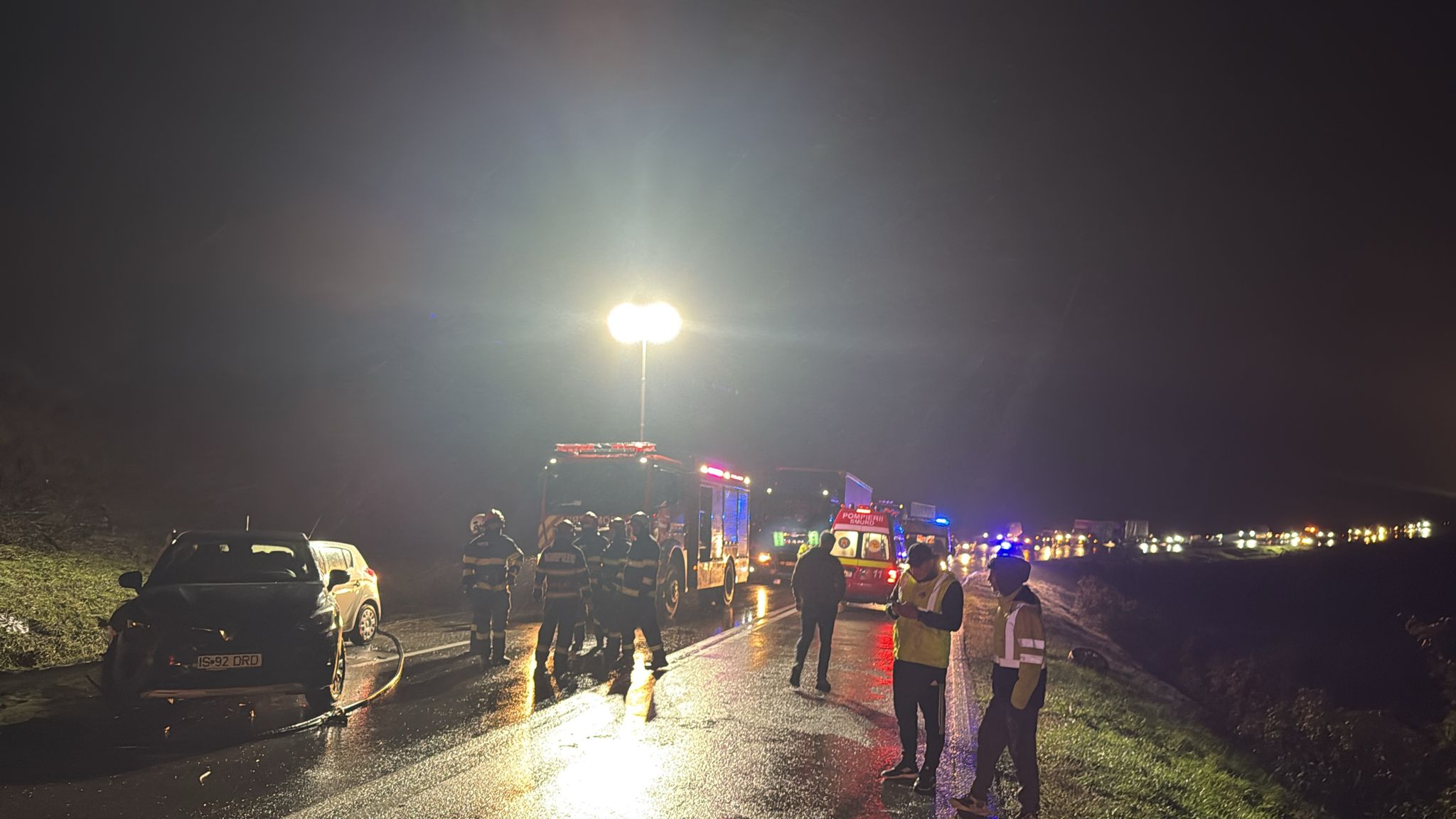 Traficul în zonă a fost restricționat temporar pentru a permite intervenția echipajelor de urgență și pentru degajarea carosabilului. Autoritățile nu au comunicat încă detalii despre cauzele accidentului sau identitatea victimelor.
