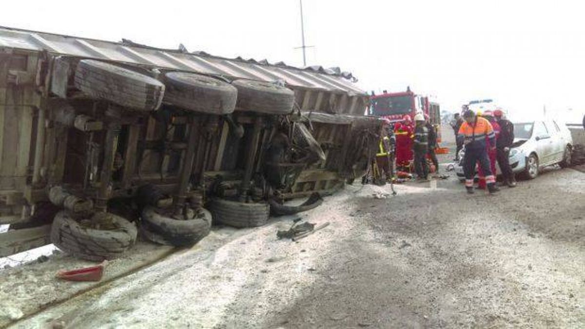 Un grav accident de circulație s-a produs vineri, în jurul orei 11:30, unde un TIR plin cu sare s-a răsturnat pe contrasens, peste un autoturism.