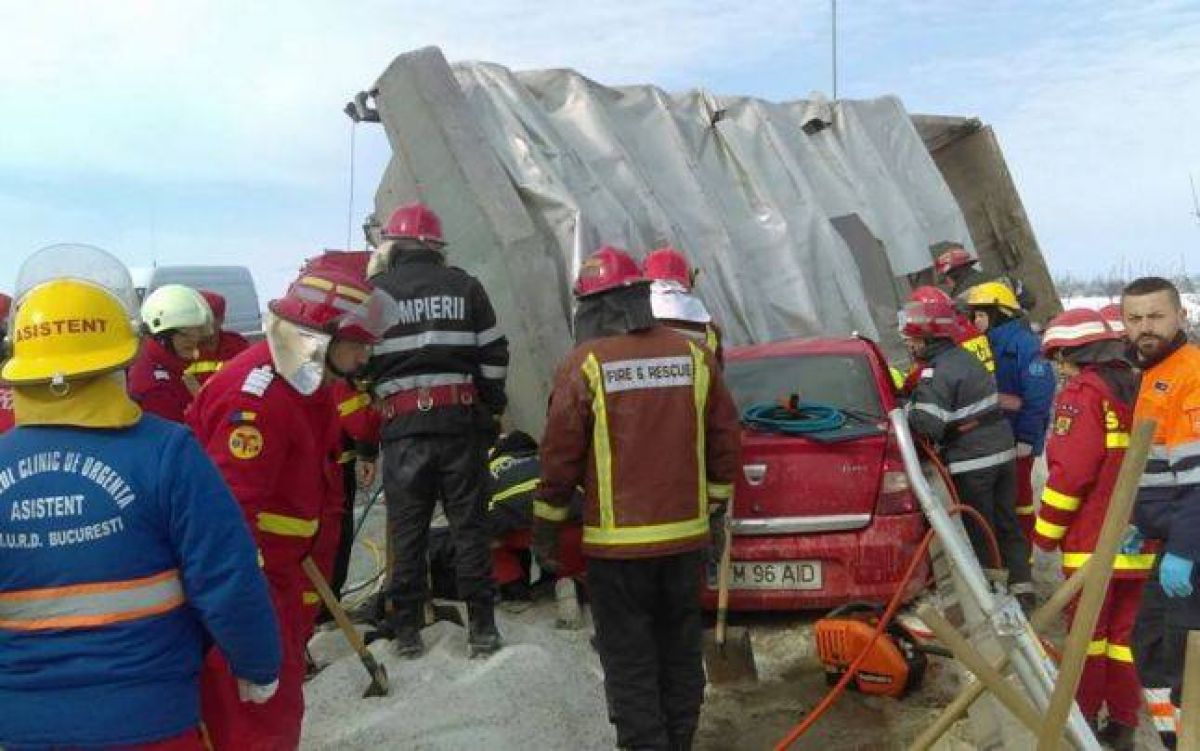 Un camion încărcat cu sare a intrat pe contrasens pe centura de Vest a orașului Ploiești, a rupt parapeţii separatori şi s-a răsturnat peste un autoturism Dacia Logan. Victima încarcerată în autoturismul Logan peste care s-a răsturnat remorca plină cu sare era conştientă. A fost preluată de elicopterul SMURD si a fost transportat ulterior la un spital din Capitală.