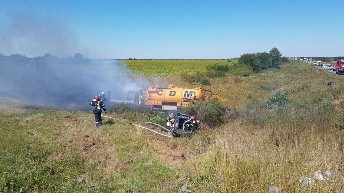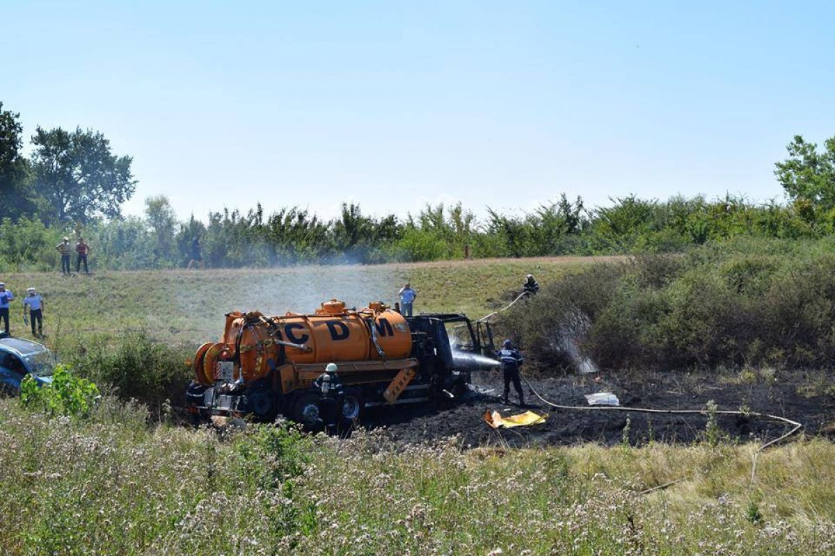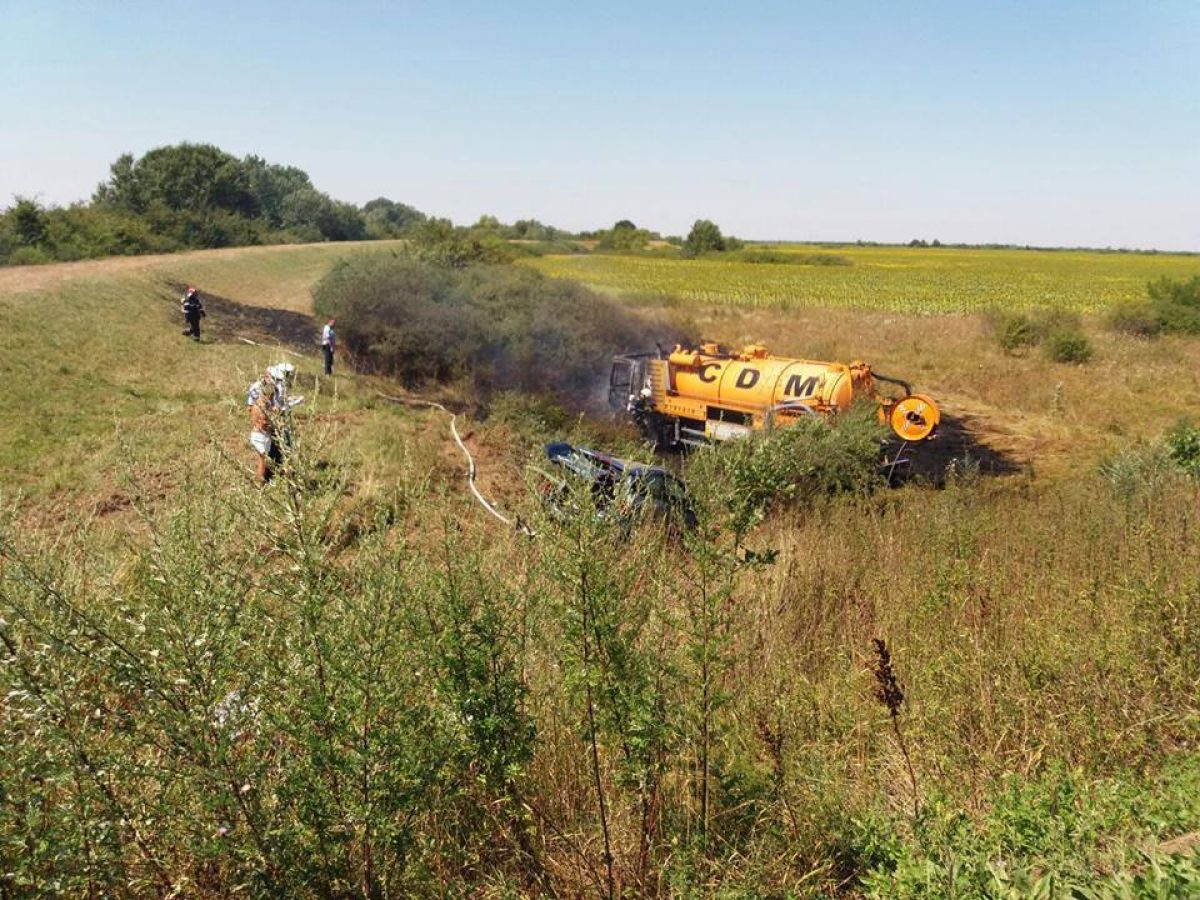 Zeci de pompieri au intervenit, marți, în apropierea localității Albina, județul Timiș. O șoferiță, în vârstă de 42 de ani, a pierdut controlul mașinii și, după ce a ajuns pe contrasens, s-a ciocnit cu putere de o vidanjă. În accident a fost implicat și un alt treilea vehicul parcat în afara șoselei. Este vorba despre mașina unui pescar, care a ajuns în câmp, după ce a fost acroșată de autocamion. Vidanja a fost foc la scurt timp după impactul puternic.