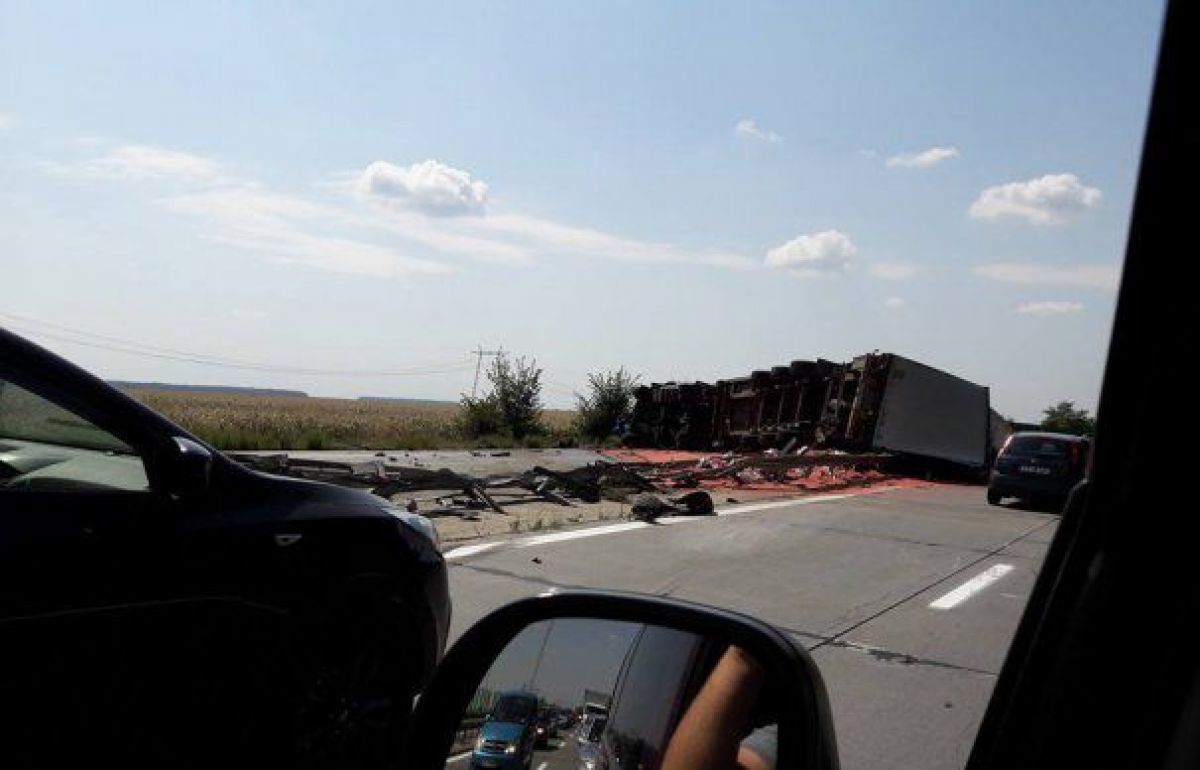 Un accident rutier s-a produs sâmbătă pe autostrada A2, unde un TIR care venea dinspre Constanța a intrat pe contrasens și s-a răsturnat peste un autoturism.