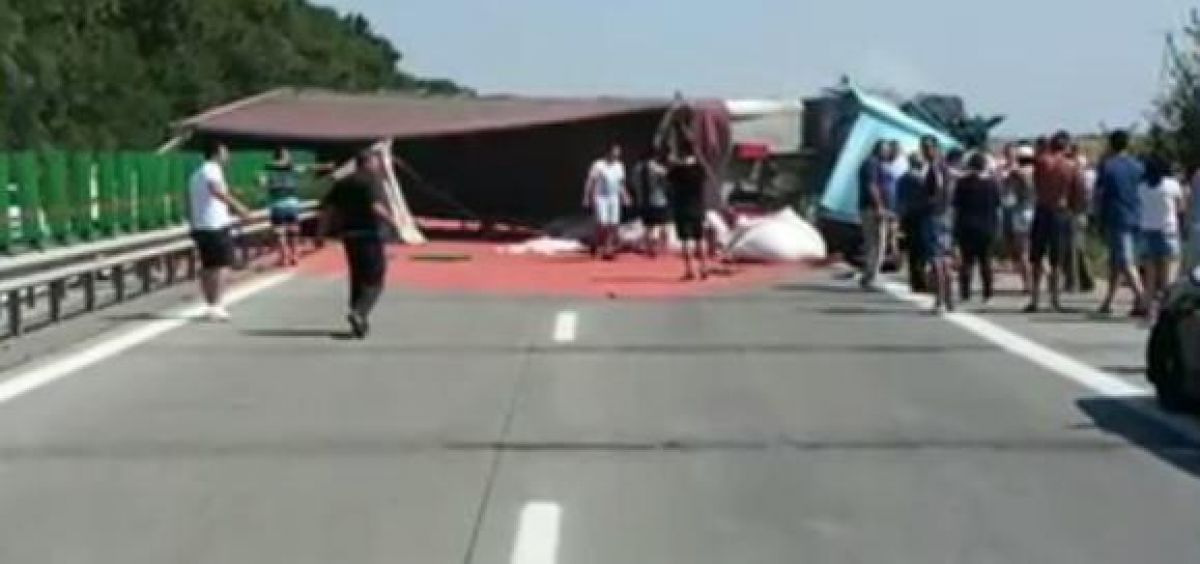 Cabina tirului, care transporta grau ambalat in saci, s-a rasturnat peste autoturism, transmite Agerpres. O alta persoana a fost ranita si prezinta escoriatii, fiind in stare constienta.