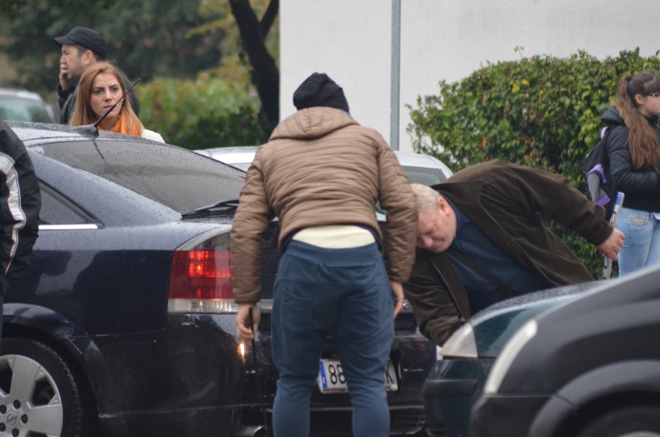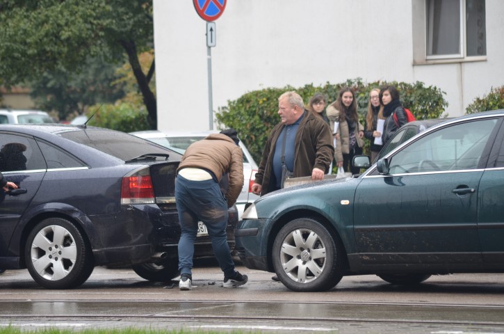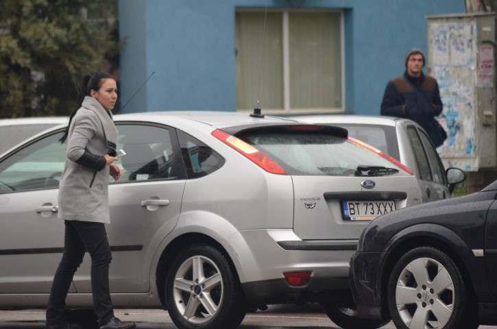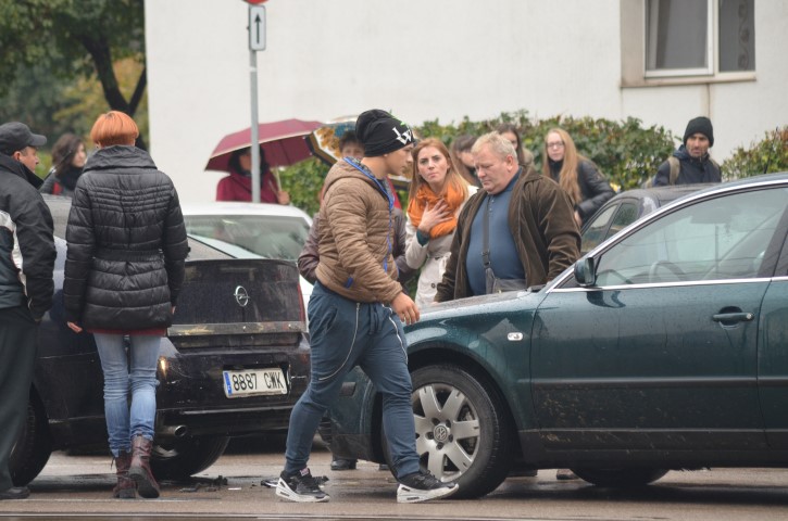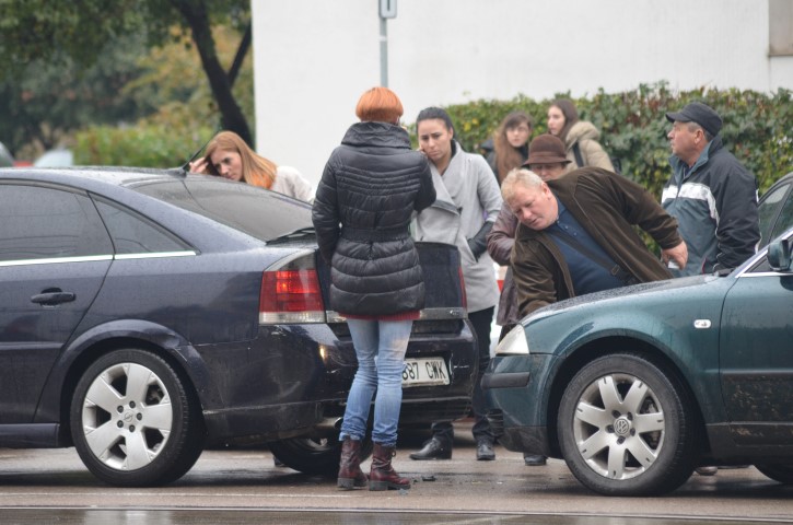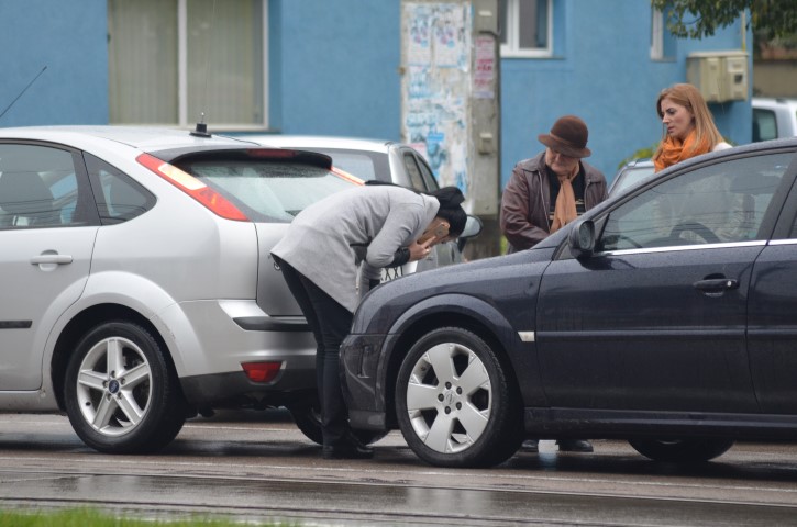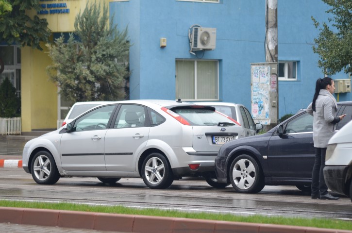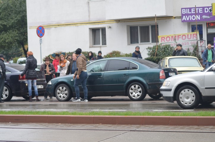 Au fost implicate un Ford, un Opel și un VW Passat. Primul autoturism, condus de o șoferiță a frânat brusc, celelalte două izbindu-se mai apoi una în cealaltă. Pagubele nu au fost unele semnificative deoarece șoferii nu circulau cu viteză. Toți pasagerii din mașini au coborât fiind pornită o ceartă generală despre cine și cum a fost vinovat. În acest timp, cei trei șoferi, cu telefoanele la ureche, evaluau pagubele la autoturisme și încercau să cadă de acord dacă vor fi chemați polițiștii rutieri sau se vor înțelege pe cale amiabilă. (G.E.)
