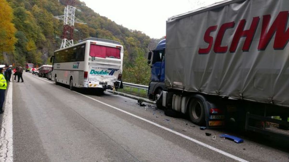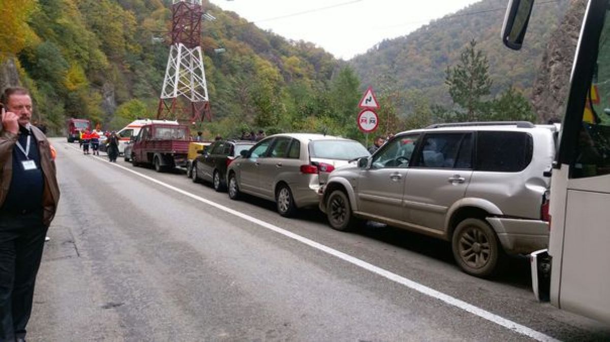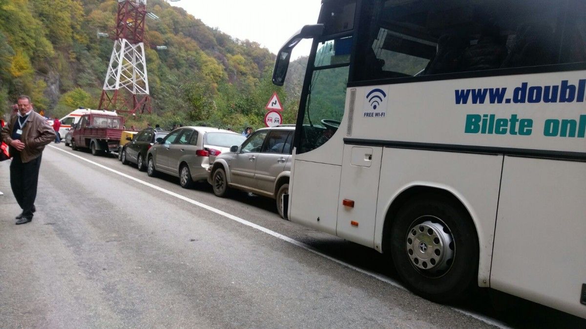 "Pe fondul nepăstrării distanţei regulamentare în mers, pe sensul Râmnicu Vâlcea - Sibiu, un tir a lovit în partea din spate un autocar, iar acesta din urmă a lovit cinci autovehicule care se aflau în faţa sa, oprite în coloană la culoarea roşie a semaforului amplasat pentru dirijarea circulaţiei pe viaduct", a declarat purtătorul de cuvânt al IPJ Vâlcea, Alina Teodorescu.