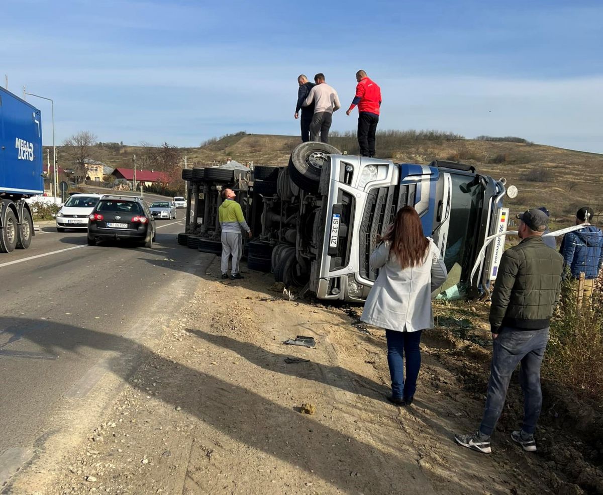 Potrivit martorilor, conducătorul auto a pierdut controlul asupra volanului într-o curbă. Camionul a pătruns pe contrasens, șoferul nereușind să îl mai redreseze, astfel că s-a răsturnat în afara carosabilului.