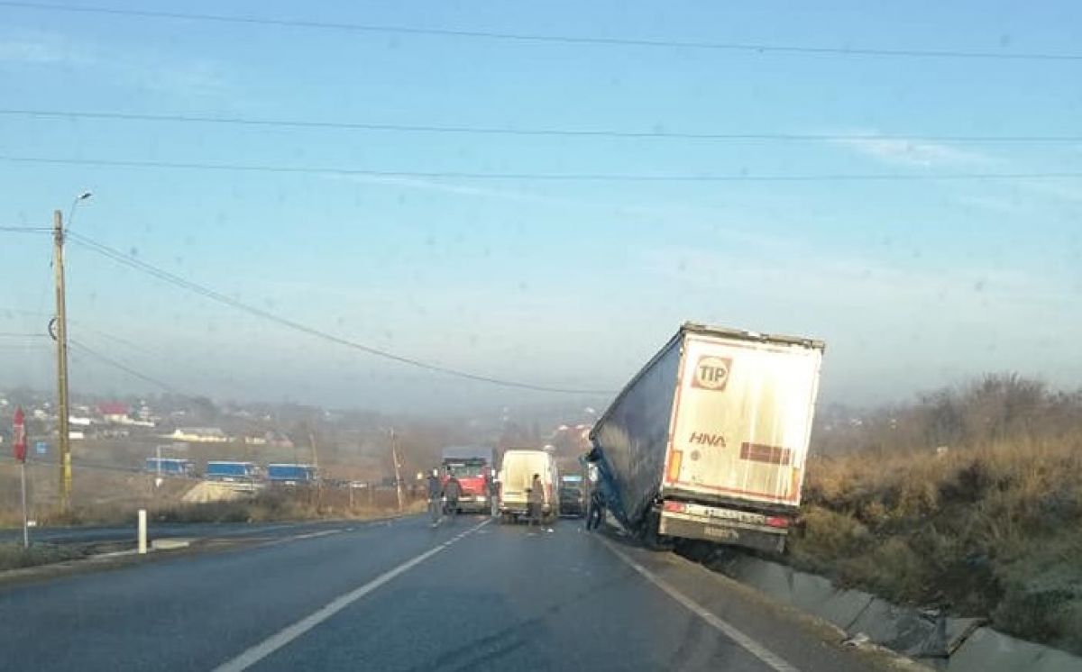 Potrivit martorilor, șoferul unui tir ar fi încercat să evite impactul cu un autoturism oprit în intersecție, a tras de volan și a ieșit de pe carosabil, oprindu-se în șanț.