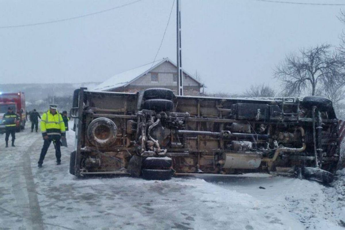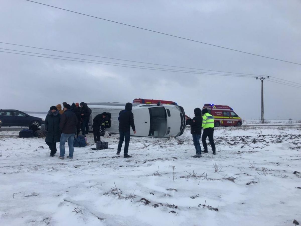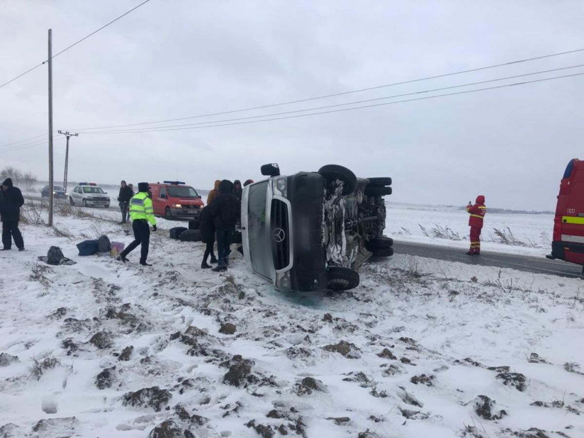Un microbuz în care se aflau 18 persoane s-a răsturnat la intrarea în Dumbrăveni dinspre Botoșani.