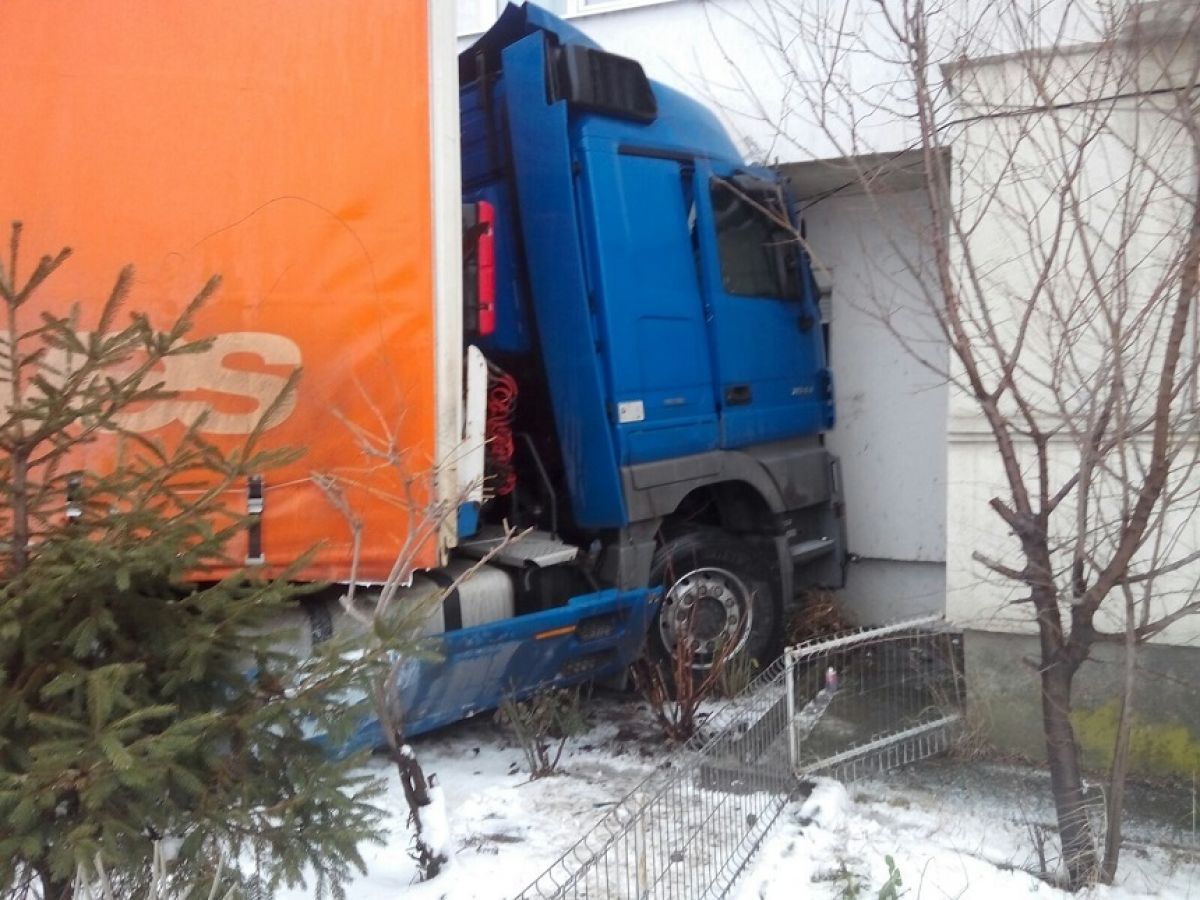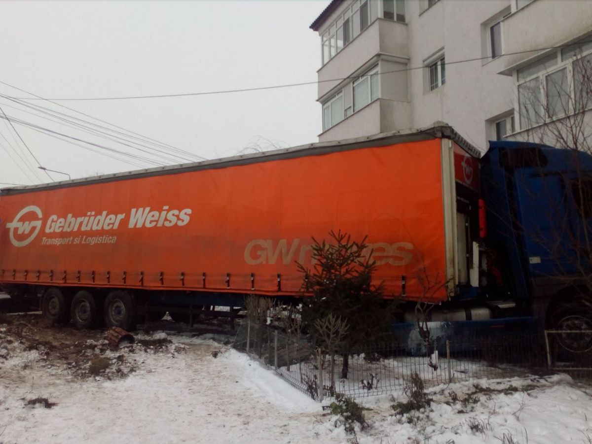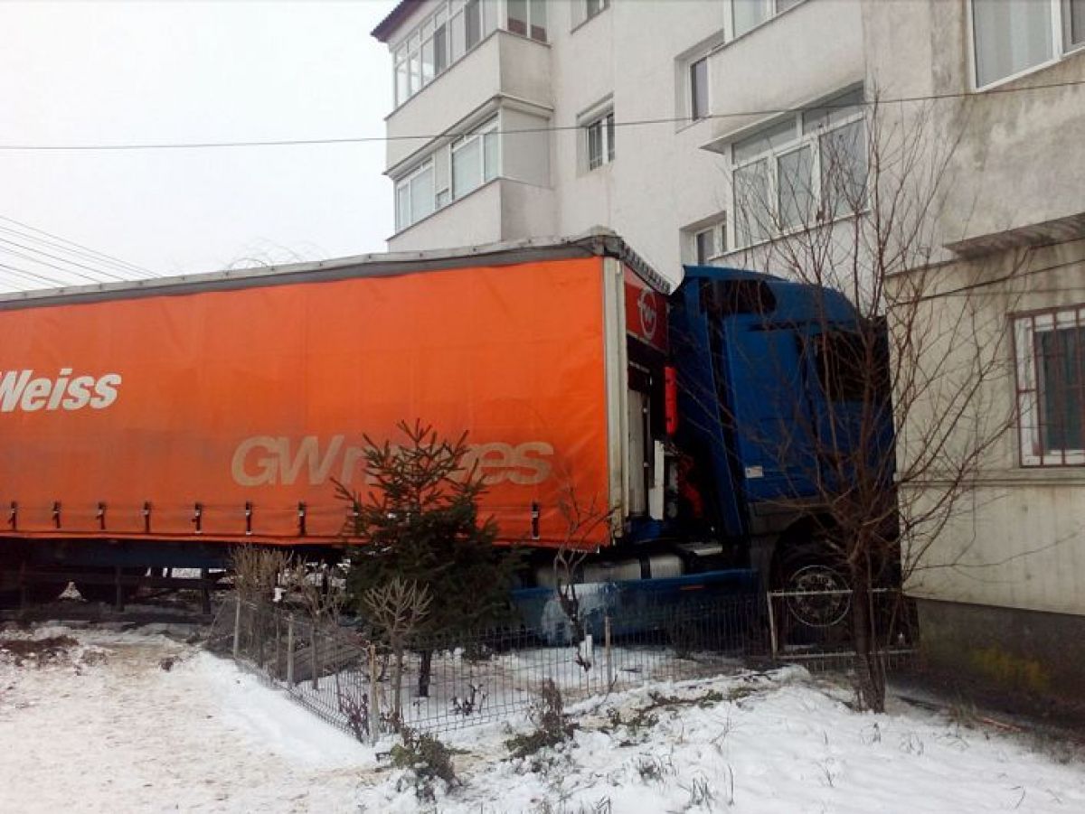 Un TIR care se deplasa în direcţia Bacău a intrat joi în scara unul bloc (pe celălalt sens de mers) imediat după marcajul de trecere pietoni din zona spitalului Adjud.