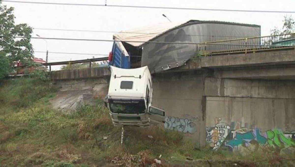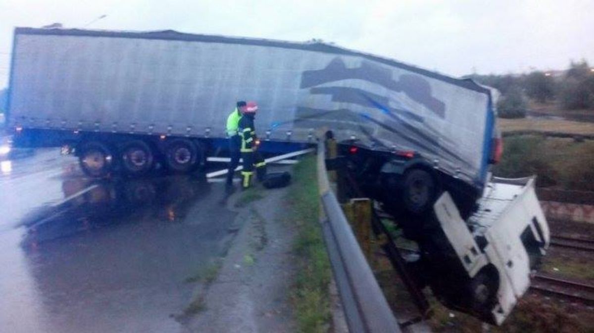 Întrucât carosabilul era umed de la ploaie, camionul a derapat la ieșirea din Galați şi a ieşit de pe carosabil, rămânând suspendat în aer cu partea din faţă.