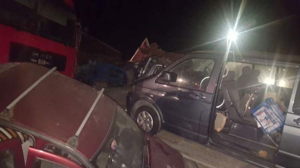 În urma impactului, maşinile au căzut pe şosea, camionul s-a răsturnat şi a acroşat o autoutilitara care circula regulamentar, iar remorca a dărâmat gardul unei case.