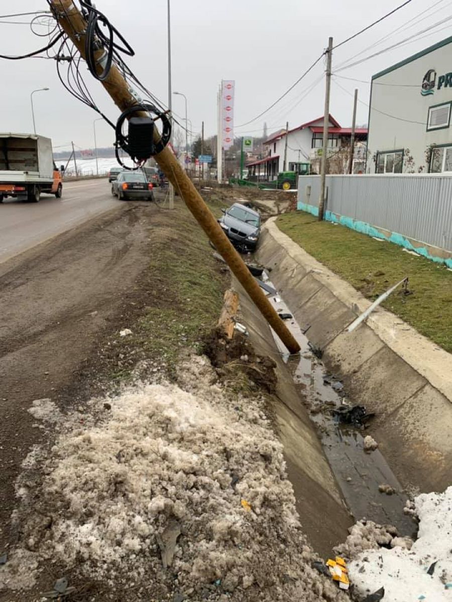 La intrarea în municipiul Botoșani dinspre Iași, șoferul unui BMW a derapat, a rupt un stâlp din lemn și a ajuns direct în șanț. Se pare că totul s-ar fi întâmplat deoarece conducătorul auto nu a adaptat viteza la condițiile de mers.